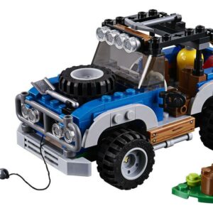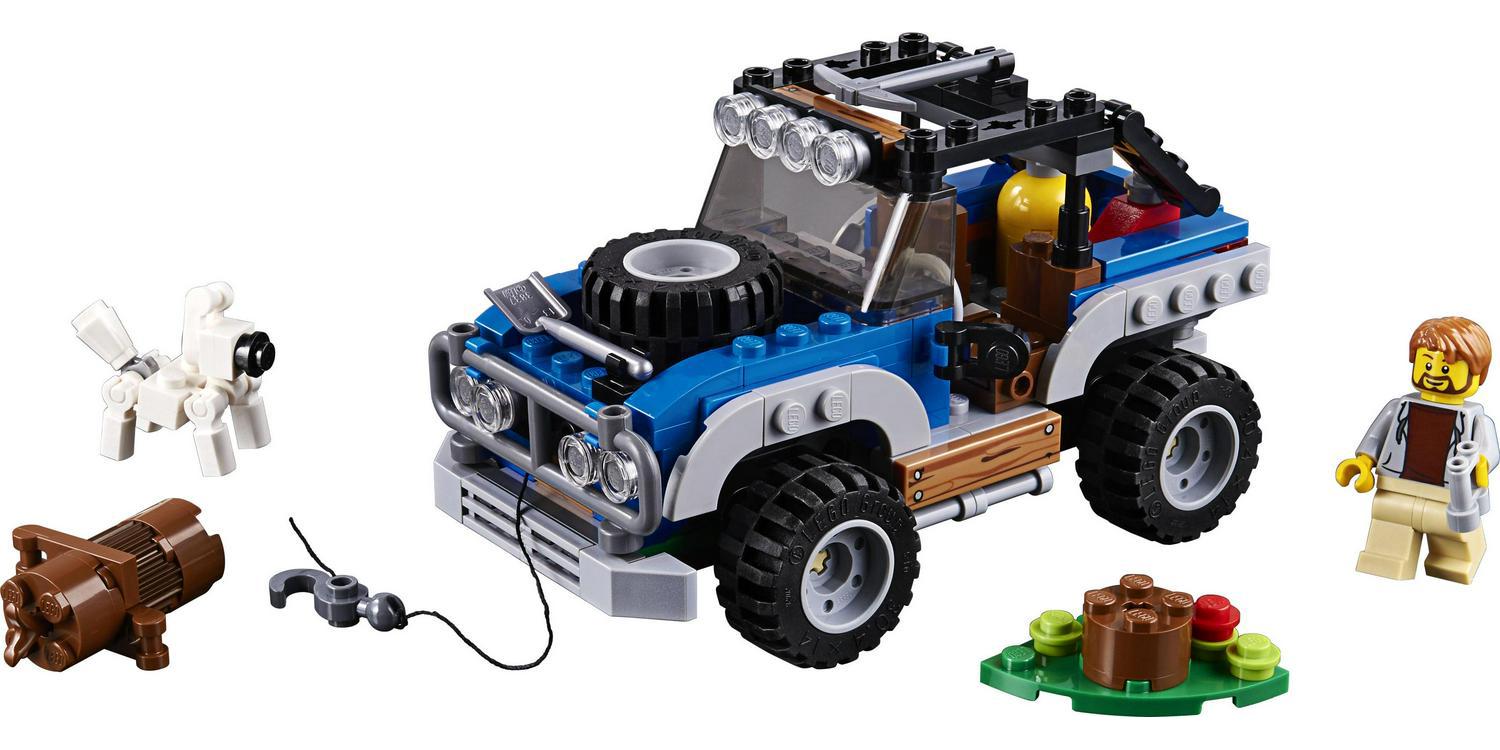 Set off on Outback Adventures with this awesome 3-in-1 set, featuring a classic Off-roader vehicle with roof spots, hood-mounted spare wheel, bull bar, minifigure cab with roll cage, and wide rims with chunky tires, plus a working winch and a buildable tree trunk and greenery. This LEGO Creator toy for boys and girls rebuilds to create a Wilderness Campsite or a Winch Helicopter for even more excitement, and includes an explorer minifigure ready for adventure with his faithful buildable dog.