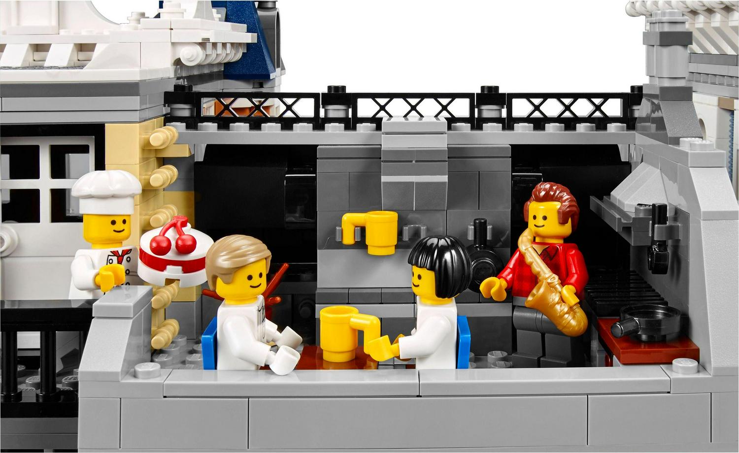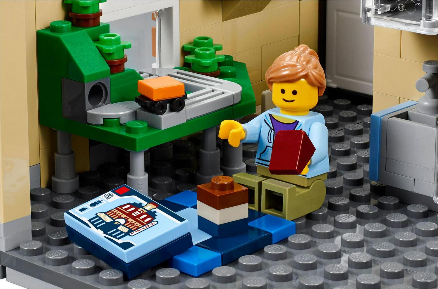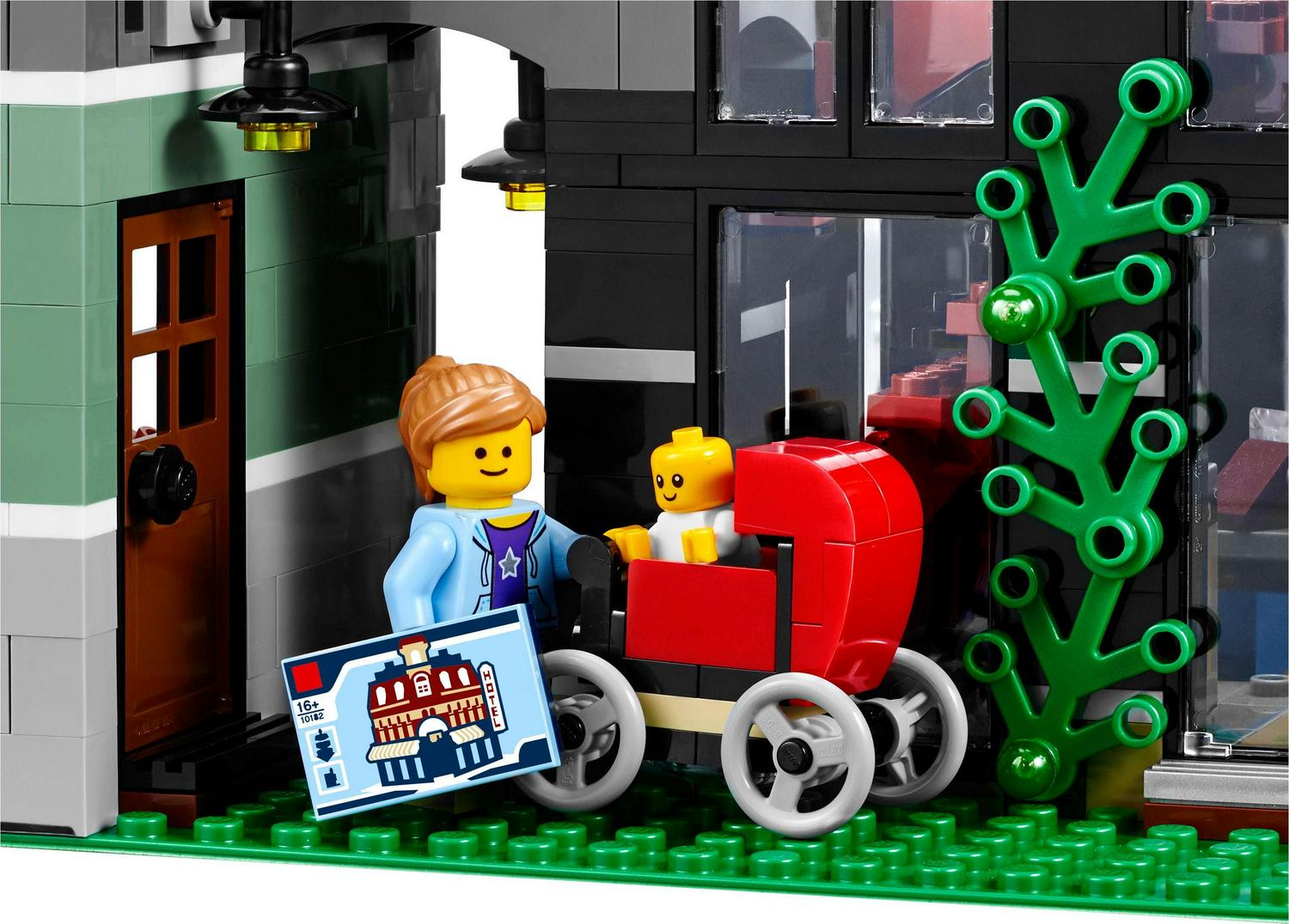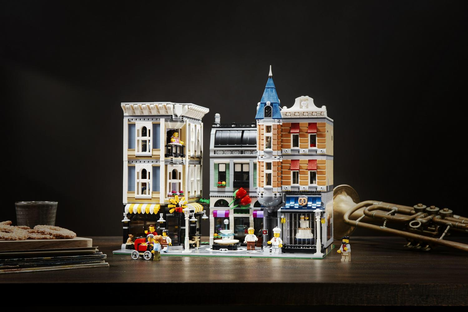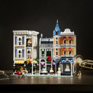 Take a trip to the amazing Assembly Square. Easy-to-remove building sections provide access to the highly detailed interior, comprising a ground level with a bakery, florist s shop and café, a middle level with a music store, photo studio and dental office, and an upper-level dance studio and apartment with access to a rooftop terrace with barbecue. The exteriorof the building features a detailed sidewalk with outdoor café furniture, fountain, streetlamps and a highly elaborate facade with beautifully detailed windows and doors, 3 buildable shop signs, spired tower and a decorative roofline. Includes 8 minifigures and a baby figure.