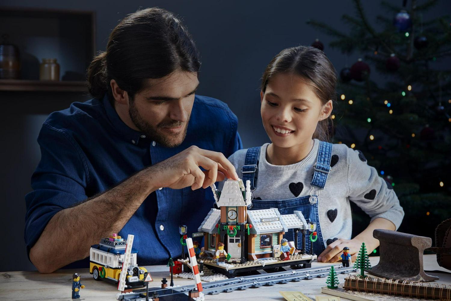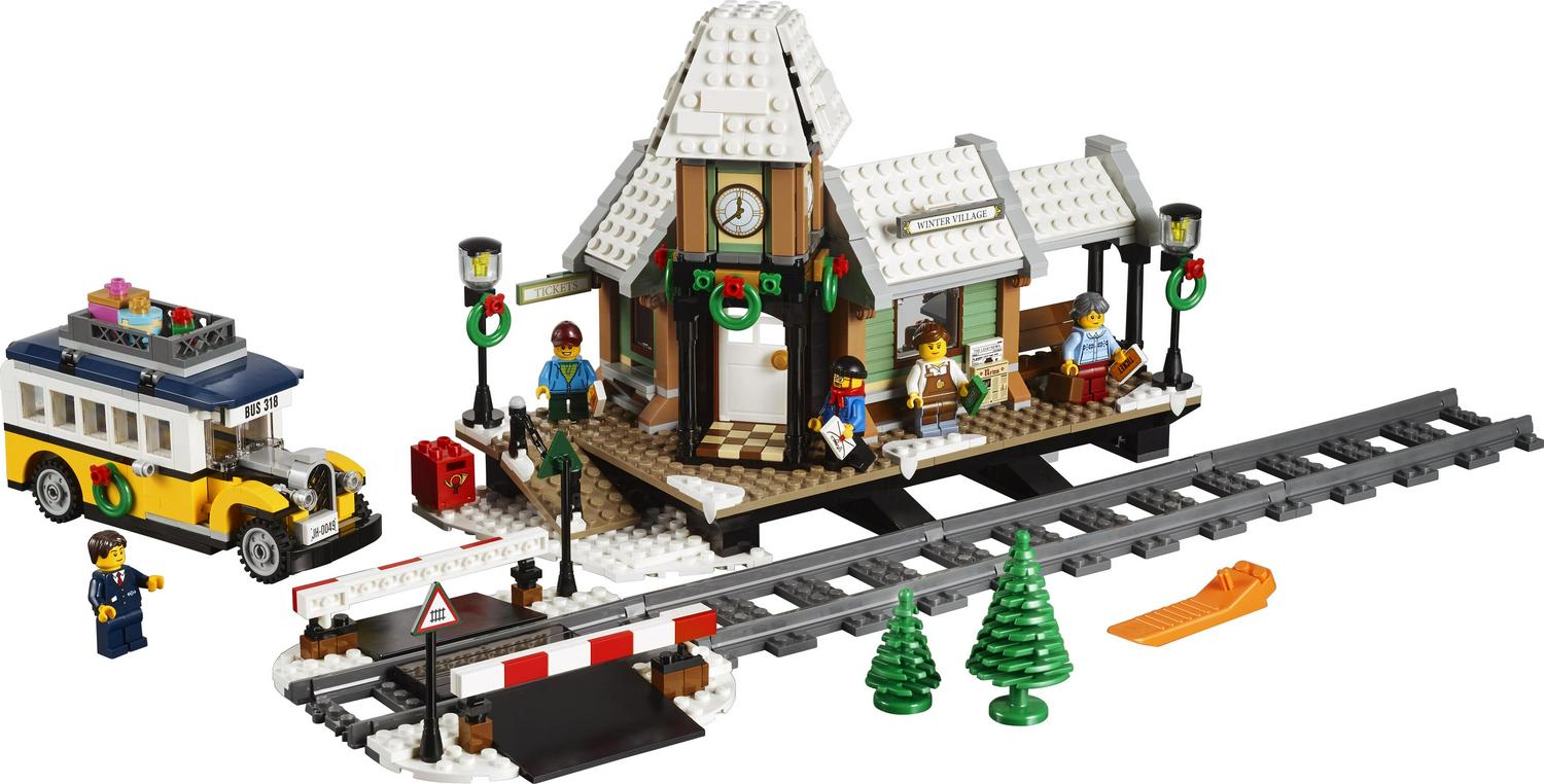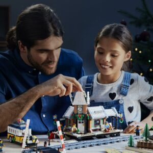Head for home with the festive Winter Village Station holiday set, featuring a snowy railroad station with wreath adorned lampposts and clock tower, platform, mailbox, green trees, snowy grade crossing with twin barriers and lights, and a beautiful, festively decorated bus with opening doors and a luggage rack with removable luggage and gift wrapped packages. This LEGO Creator Expert model also includes a ticket counter with a timetable and a transaction counter window with room for sliding out tickets to travelers, plus a coffee shop with a serving hatch and a detailed interior with an espresso machine, cups, cash register, and a menu.