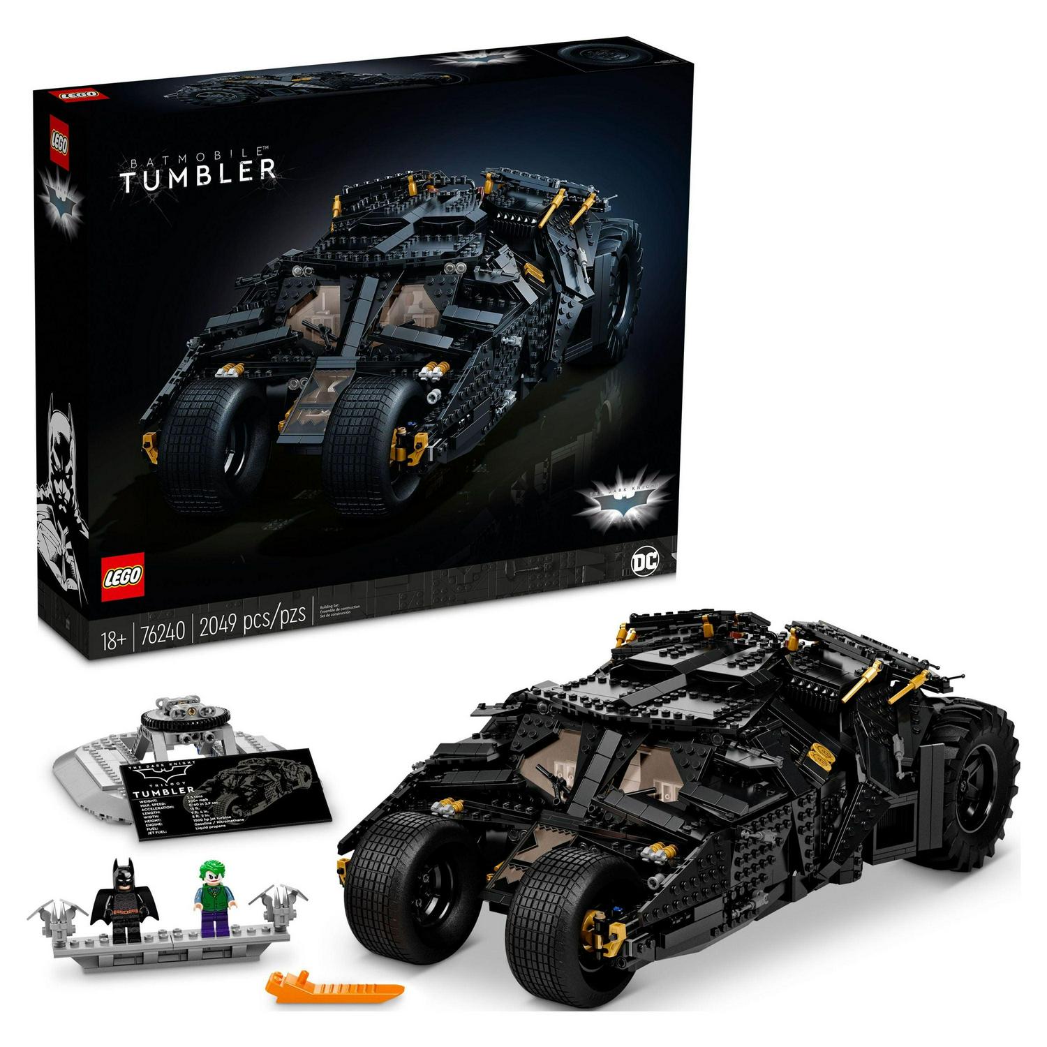 LEGO DC Batman Batmobile Tumbler (76240) set for adults featuring a classic Batman car will stretch your construction skills and capture the style of one of the most iconic cars in cinema history. The impressive build-and-display Tumbler from the Dark Knight trilogy of Batman movies features an opening roof, which provides access to the driver and passenger seats and control panel. Batman and The Joker minifigures are included with a stand. With a sturdy base to display the finished model at its best, your recreation of the ultimate armored crime-fighting machine – Batman’s Batmobile Tumbler model car will provide pleasure long after the hands-on work has been completed. Rediscover the joy of creative construction with LEGO building sets for adults. Satisfying to build and stunning to display, adult LEGO kits make great birthday presents, holiday or Christmas Batman gifts and personal treats for any fan of model making or comic-book culture. Measures over 6 in. (16 cm) high, 17 in. (45 cm) long and 9 in. (25 cm) wide. Contains 2049 pieces.
