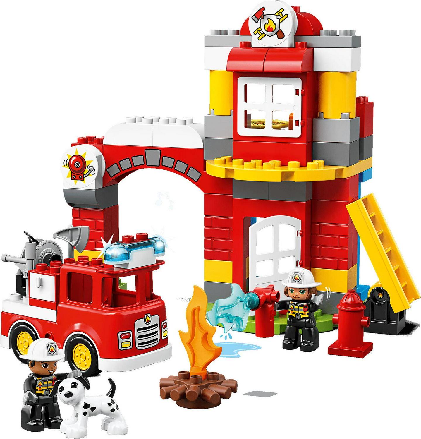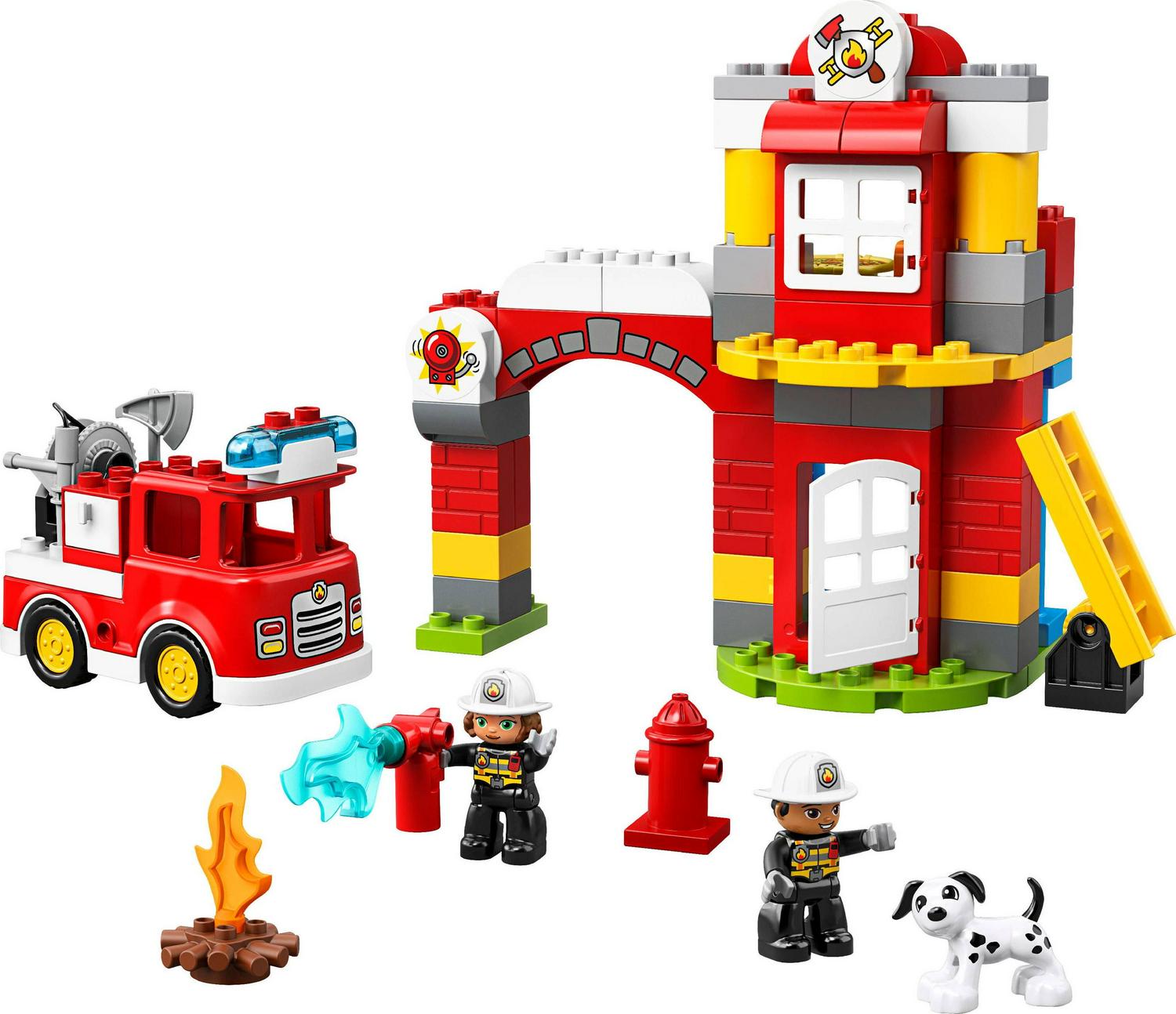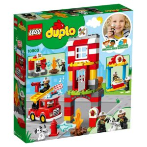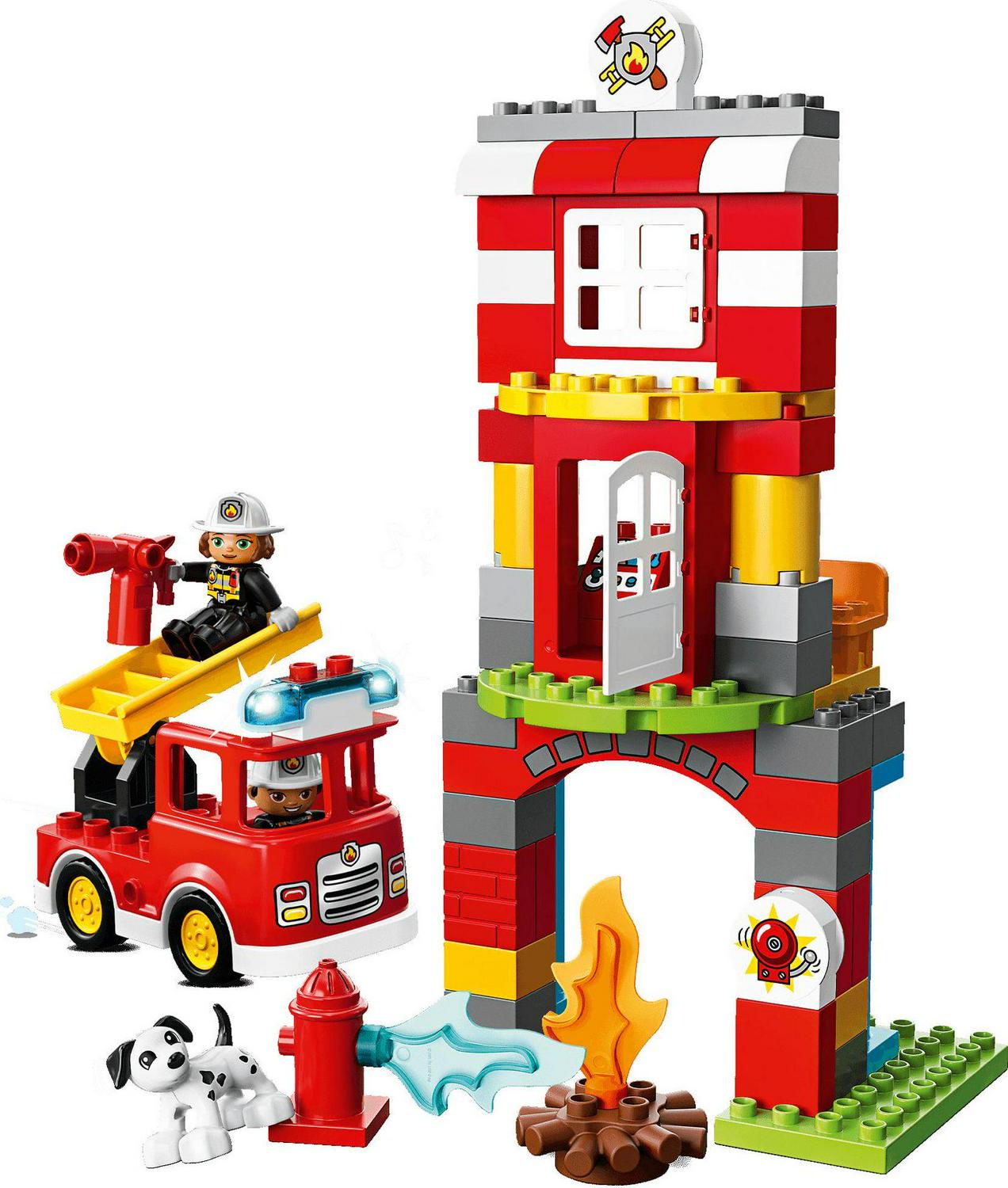 Play out real-life scenarios in LEGO DUPLO Town: a recognizable world with modern DUPLO figures Visit the easytobuild 10903 Fire Station and enjoy pretend play, helping the firefighters as they practice putting out the campfire and climbing the ladder to rescue the station dog in the tower When the call comes in, help your toddler jump the firefighters into the fire truck, turn on the flashing light and siren, and head off on another daring rescue! Includes 2 DUPLO figures plus a dog figure