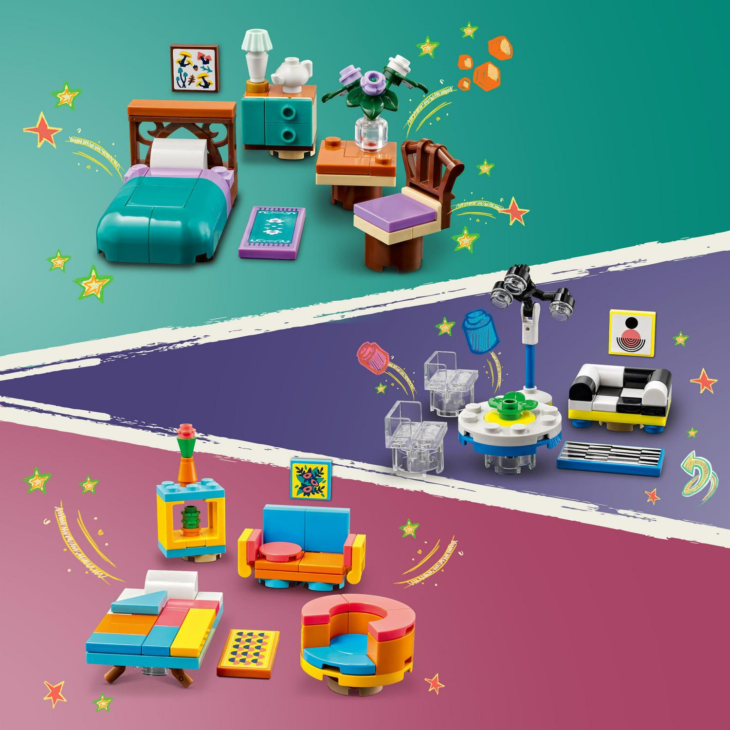 – Characters and Accessories – LEGO Friends house for older kids includes 9 characters, 2 pets, and accessories like moving boxes, tin of paint, and saxophone.