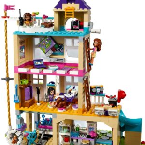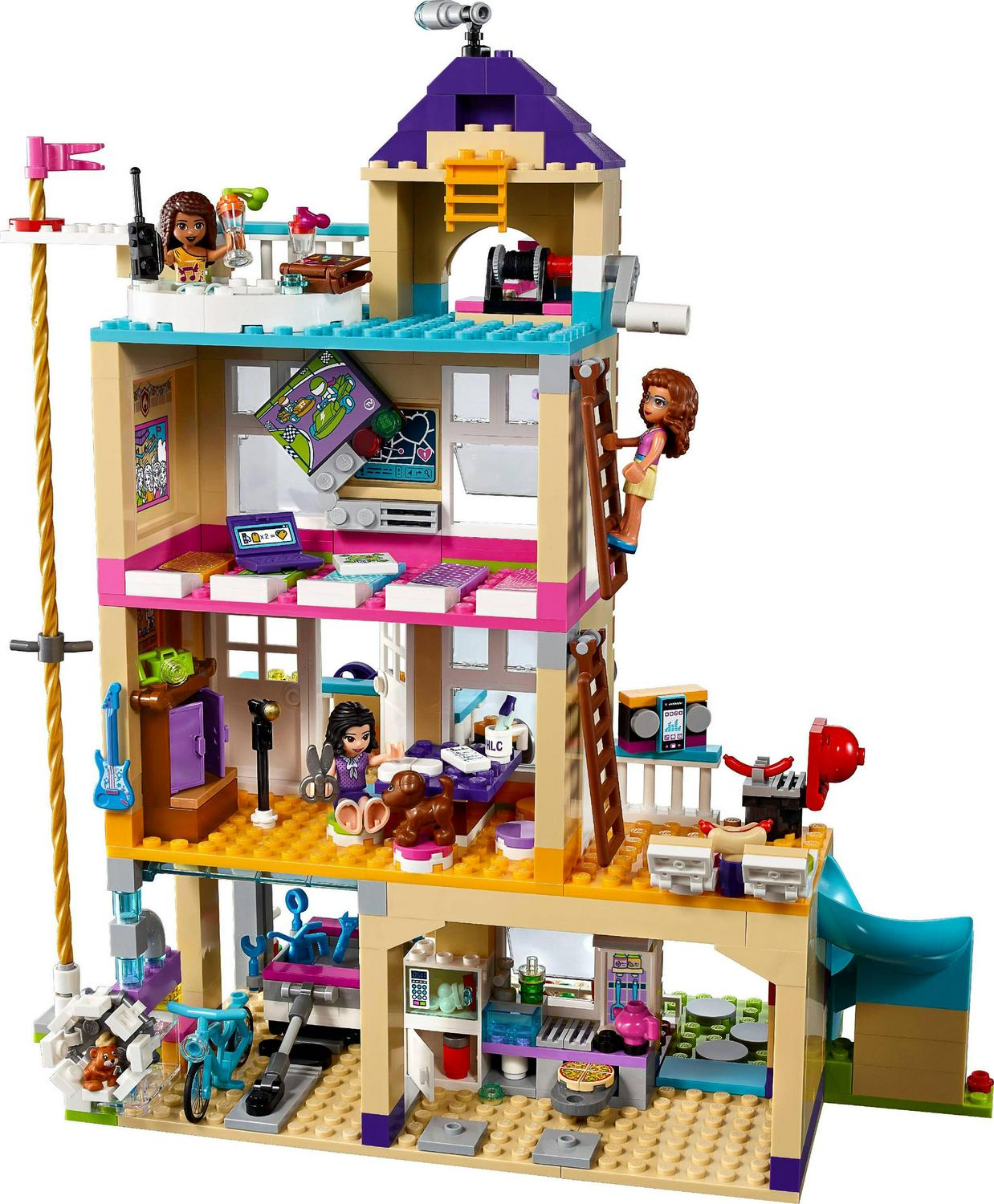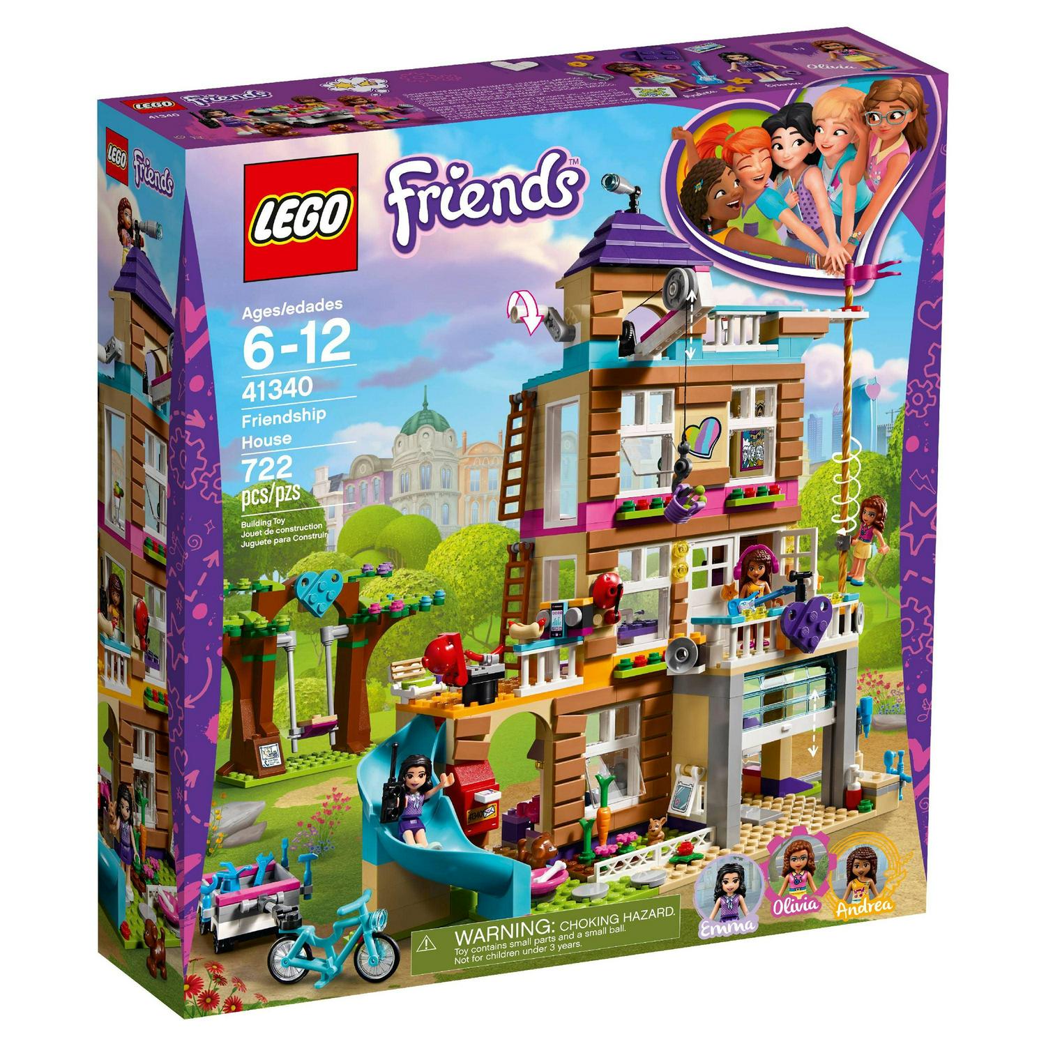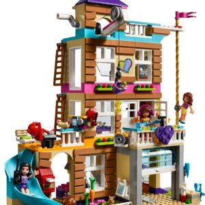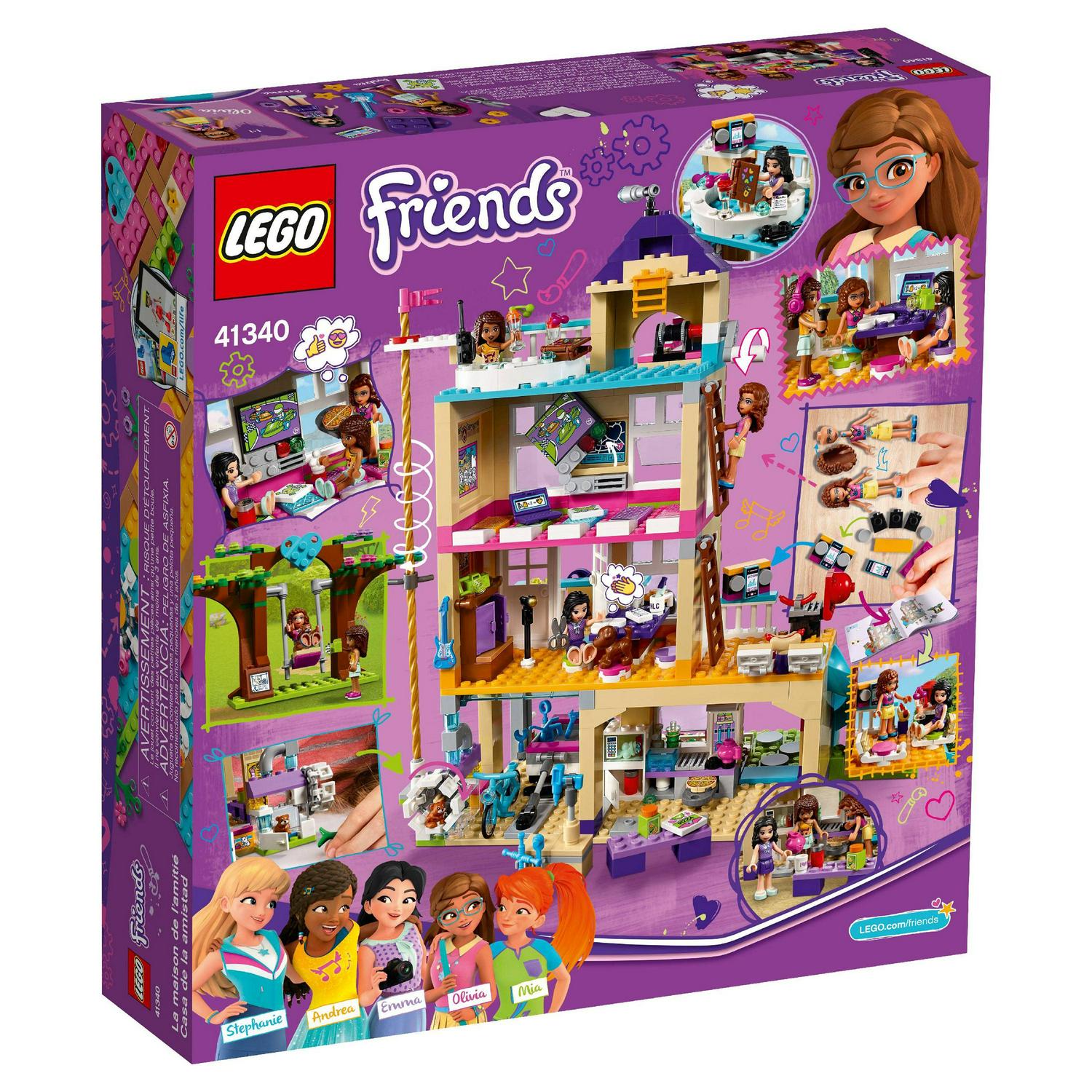 The LEGO Friends 41340 Friendship House is the ultimate base for special moments between the friends of Heartlake City whether starting adventures or enjoying some downtime. This popular toy for kids features a kitchen with kitchenette tools, a living room with craft table, bedroom with double-sided TV screen, terrace with speakers, barbecue, hot tub, juice bar, and a lookout tower on the roof. Outside, there s a swing, a bike with a trailer full of tools, and lots of cool features in this converted fire station building including a working pulley, alarm, pole, slide, and a garage with opening door. The house includes 3 mini-dolls plus 3 animal figures.