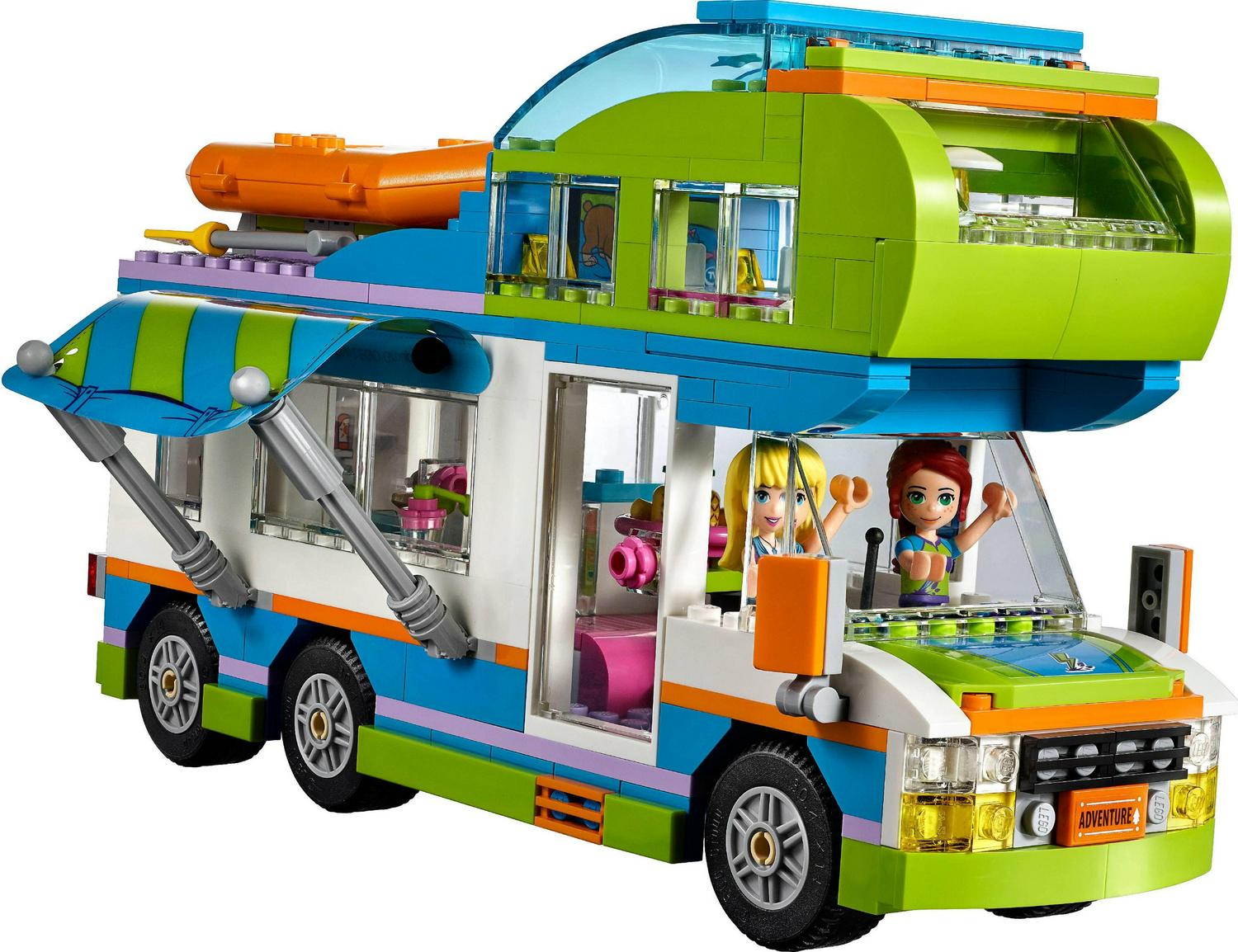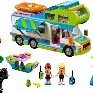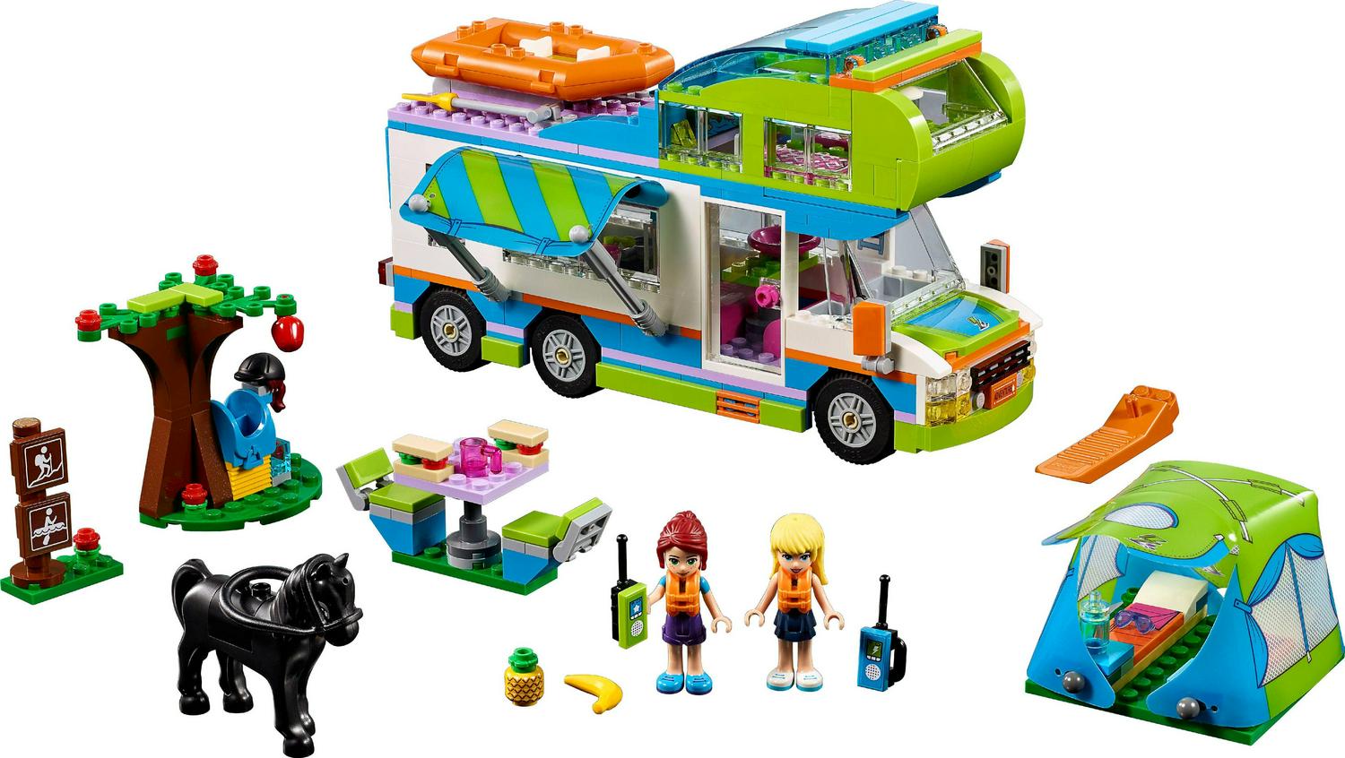 LEGO Friends 41339 Mia s Camper Van makes camping with friends a dream! Lift off the roof of this cool playset for easy access to the kitchen and bathroom inside, flip open the lid of the upstairs sleeping area, put up the canopy and get to work on the tent with 2 beds inside. There s also a picnic table, an inflatable dinghy and a friendly horse for endless outdoor adventures!