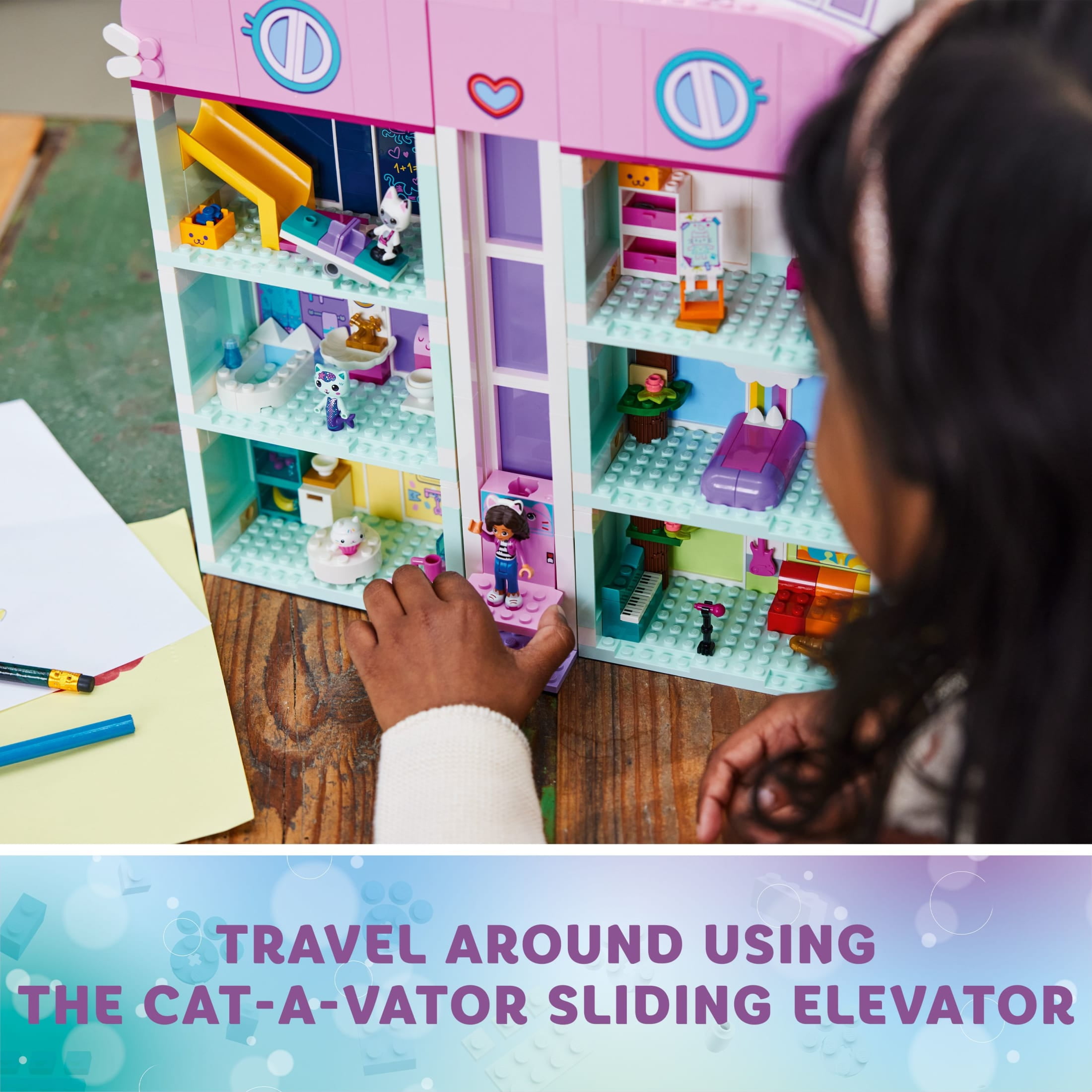 8 colorful room playhouse – Fans of the DreamWorks Animation TV show ages 4+ can explore a home of their own with LEGO Gabby’s Dollhouse (10788), featuring popular characters and authentic accessories 4 iconic characters from the tv show – Kids join in the fun with a Gabby minifigure, plus Pandy Paws, MerCat and Cakey figures Authentic accessories include a banana, berry, cupcake, cup, bowl, bottle, scissors, paint brush, palette, hairbrush, shampoo bottle, book, flower, microphone, guitar, saxophone and lots more Loads to discover with pretend play – Kids can bake in the play kitchen, slide in the playroom, get arty in the art room, play instruments in the music room, relax in the bathroom, nap in the bedroom or party on the rooftop dance floor Gift for Gabby fans – LEGO Gabby’s Dollhouse is a great preschool toy and gift for kids that love playing with dolls and accessories. With a Starter Brick and simple building steps, kids with a passion for Gabby’s Dollhouse will develop key skills as they enjoy endless imaginative, pretend play Packed to the rooftop with fun – The dollhouse measures over 13.5 in. (34 cm) high, 12.5 in. (31 cm) wide and 3.5 in. (9 cm) deep Fun building guide – A printed picture guide shows the purpose of each building step, and the LEGO Builder app offers digital zoom and rotate tools so kids can visualize their model as they build Expand the fun – Explore the full range of LEGO sets from the Gabby’s Dollhouse collection including 10785 Bakey with Cakey Fun, 10787 Kitty Fairy’s Garden Party, and 10786 Gabby & MerCat’s Ship & Spa