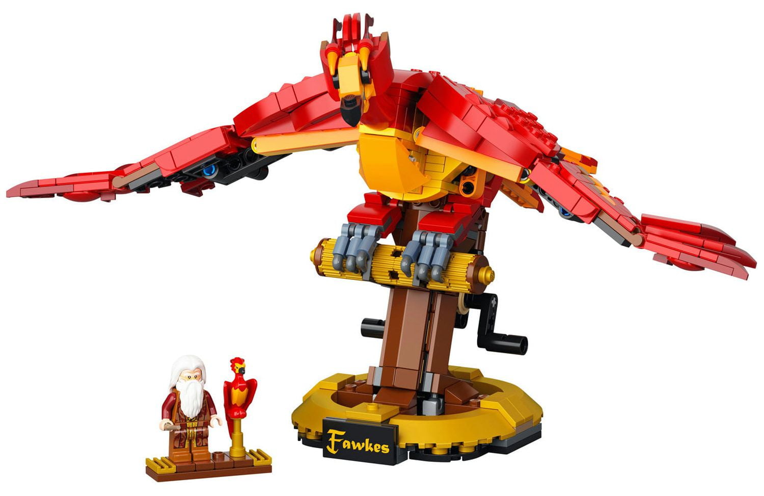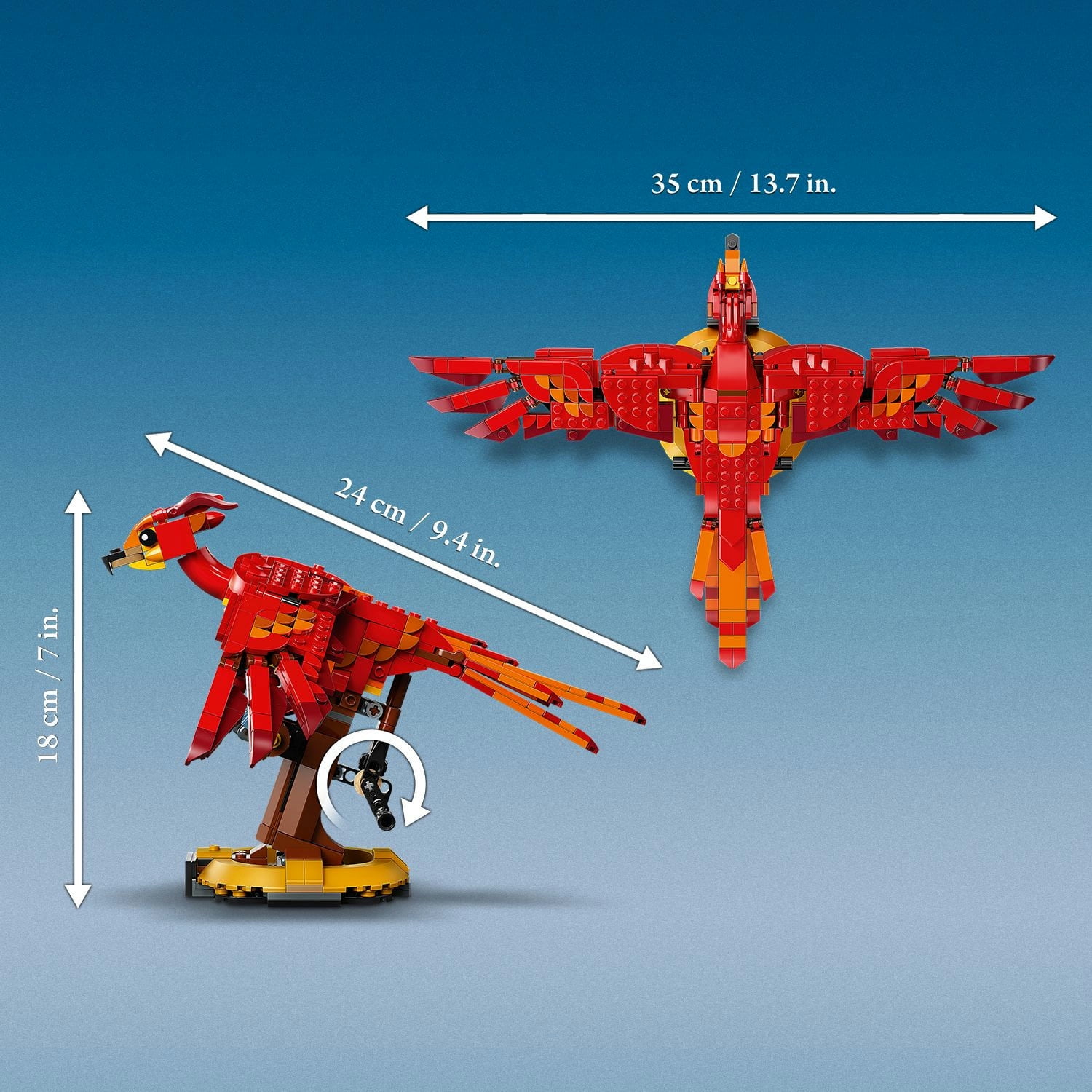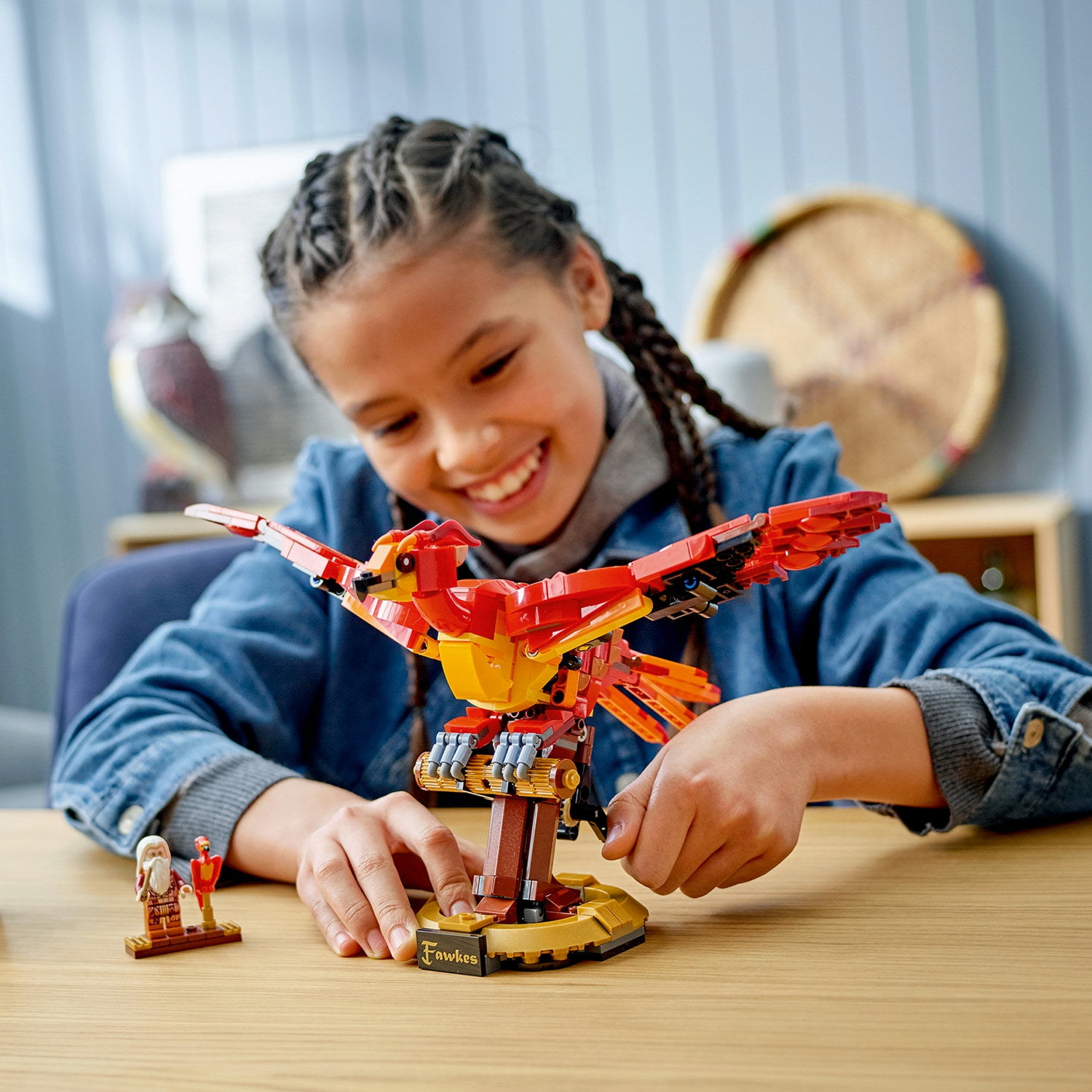 LEGO Harry Potter Fawkes, Dumbledore’s Phoenix (76394) is a realistic model of the iconic phoenix from the Harry Potter movies that kids can display – and ‘fly’ – for all their friends to admire. Buildable Fawkes the phoenix with ‘flying’ wings This 597-piece, brick-built model recreates the fiery feathers, powerful beak and graceful flight of Fawkes the phoenix. The model is not only rewarding to build and impressive to display – it also features realistically jointed wings that move. Kids simply turn the handle at the rear to make the articulated wings flap gracefully up and down, displaying Fawkes’ full wingspan of over 14 in. (35 cm). The collectible model stands on a sturdy base and is accompanied by an Albus Dumbledore LEGO minifigure alongside a smaller Fawkes figure.