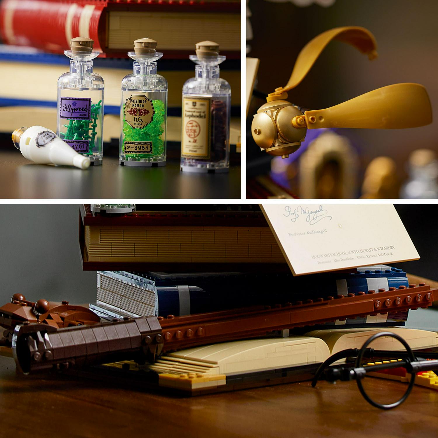 – The build consist of iconic artifacts: Harry s wand & glasses, a tray of potions, Tom Riddle s diary, the Golden Snitch and a Hogwarts scarf