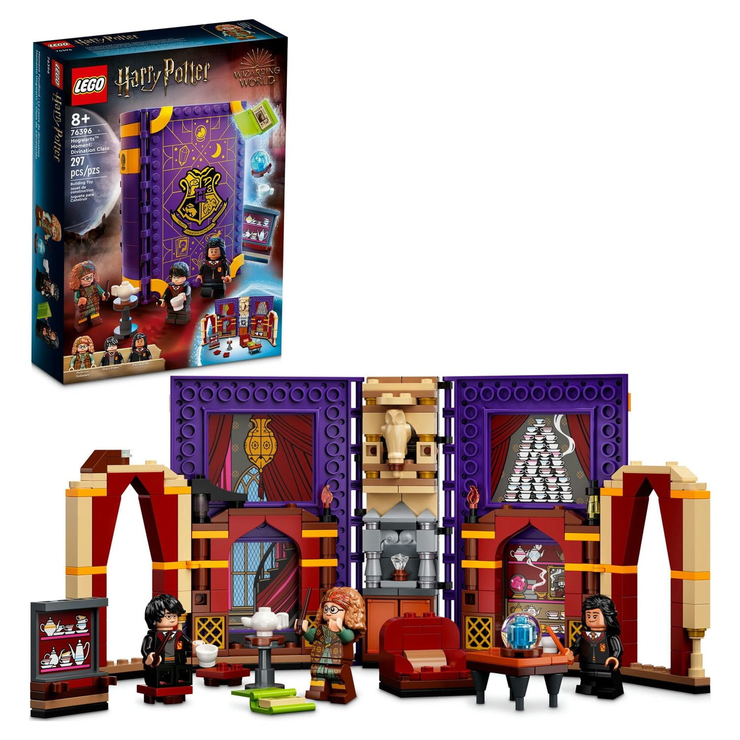 LEGO Harry Potter Hogwarts Moment: Divination Class (76396) is an instant playset inside a brick-built playbook packed with popular characters and familiar features from Professor Trelawney’s Divination classroom, for ages 8+.Bursting with magical play possibilities.The LEGO playbook’s spellbinding cover unlocks to reveal a magical classroom full of adventures. There are 3 minifigures – Professor Trelawney, Harry Potter and Parvati Patil – plus lots of cool accessories. Some elements arebuilt in, such as the storage cupboard, while others are detached, like the armchair, desk, chairs, crystal ball and teacups, which lift out to expand the play space. The set combines with others in the range and packs neatly into the closed playbook, so kids can carry it wherever they go and store it neatly until next time.Enchanting gifts for kids.If you’re looking for a truly magical treat, LEGO Harry Potter playsets offer a range of captivating gifts that will delight any young witch or wizard.