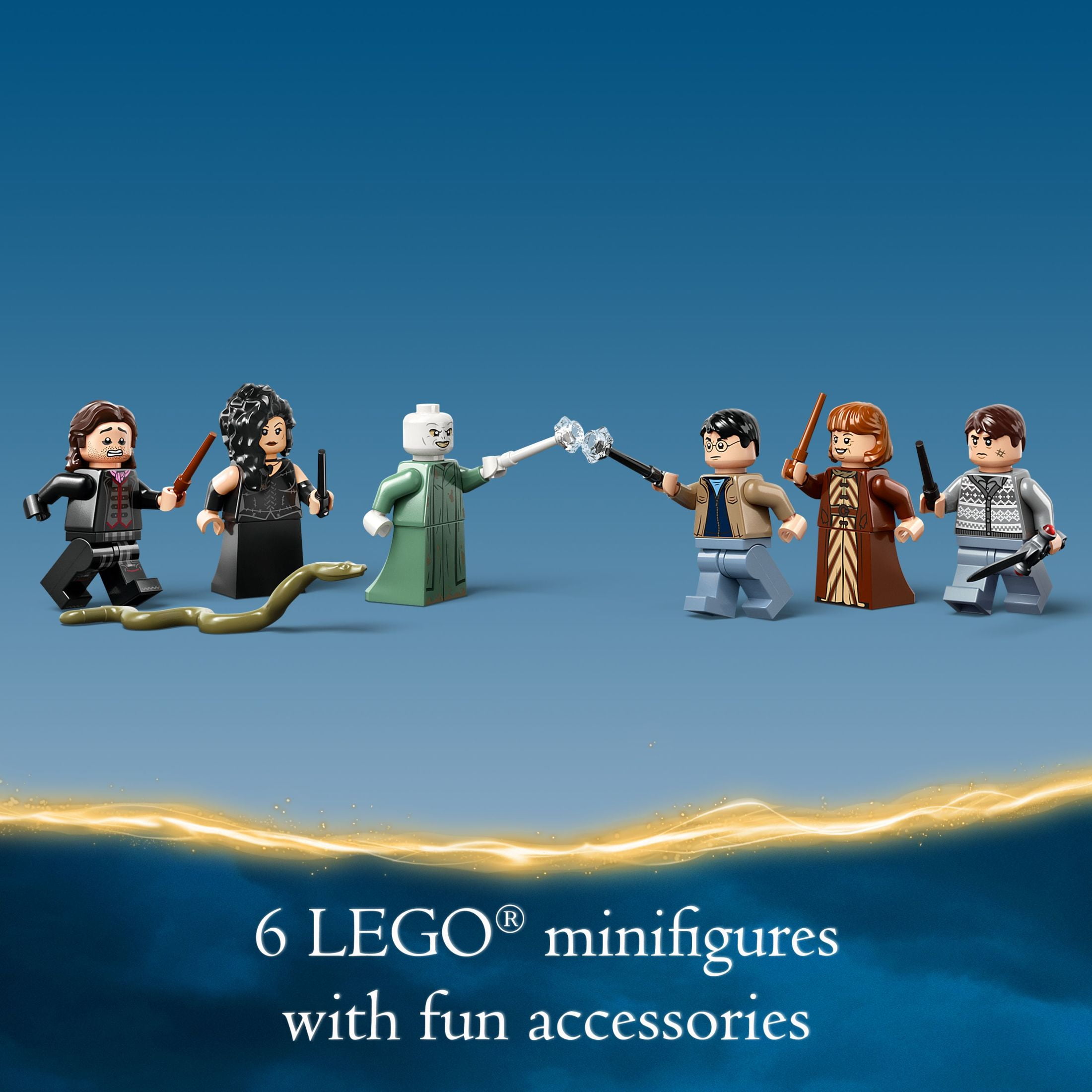 The Battle of Hogwarts building toy set (76415) – Build the Hogwarts Castle courtyard and reenact the Voldemort vs. Harry Potter duel from the climax of Harry Potter and the Deathly Hallows – Part 2 6 LEGO minifigures – Harry Potter and Voldemort, each with a wand and spell-casting element, Neville Longbottom with the Sword of Gryffindor, Scabior, Molly Weasley and Bellatrix Lestrange Rebuilds into a bridge – The castle modules can be rearranged to make a bridge and recreate another iconic location. The set also includes a Nagini figure for creative play Fun gift idea – Give this 730-piece buildable LEGO model as a special treat, birthday present or holiday gift to kids aged 9 and up who are into Harry Potter and the Wizarding World Build, play and display – This Hogwarts Castle model measures over 11 in. (28 cm) high, 17.5 in. (44 cm) wide and 4.5 in. (11 cm) deep in its basic formation Modular building toy – This LEGO Harry Potter toy set is one of a series of modular sets that combine to create your own Hogwarts Castle A helping hand – Discover intuitive instructions in the LEGO Builder app where builders can zoom in and rotate models in 3D, track their progress and save sets as they develop new skills