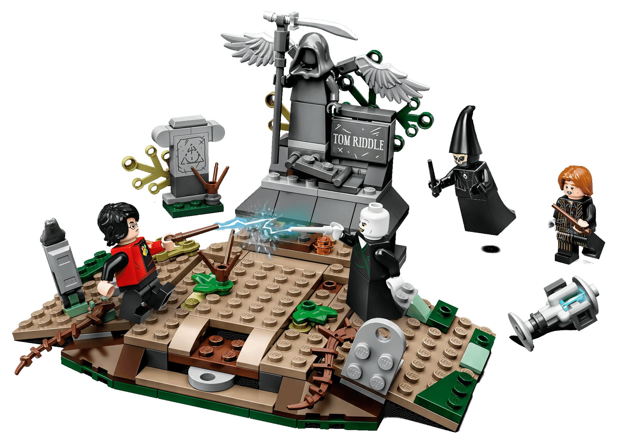 Includes 4 minifigures: Harry Potter™ with wand and Triwizard Challenge outfit, Lord Voldemort™ with wand, Peter Pettigrew with wand and a Death Eater™ This building set for kids features the Little Hangleton graveyard from Harry Potter™ and the Goblet of Fire™ with tombstones and vegetation Pull the brick lever to raise the Voldemort™ figure from a hidden compartment beneath the ground into an upright position Accessories include a cauldron, bone, dagger and the Triwizard Cup This LEGO® Harry Potter ™ set measures over 3” (10cm) high, 6” (17cm) wide and 5” (14cm) deep