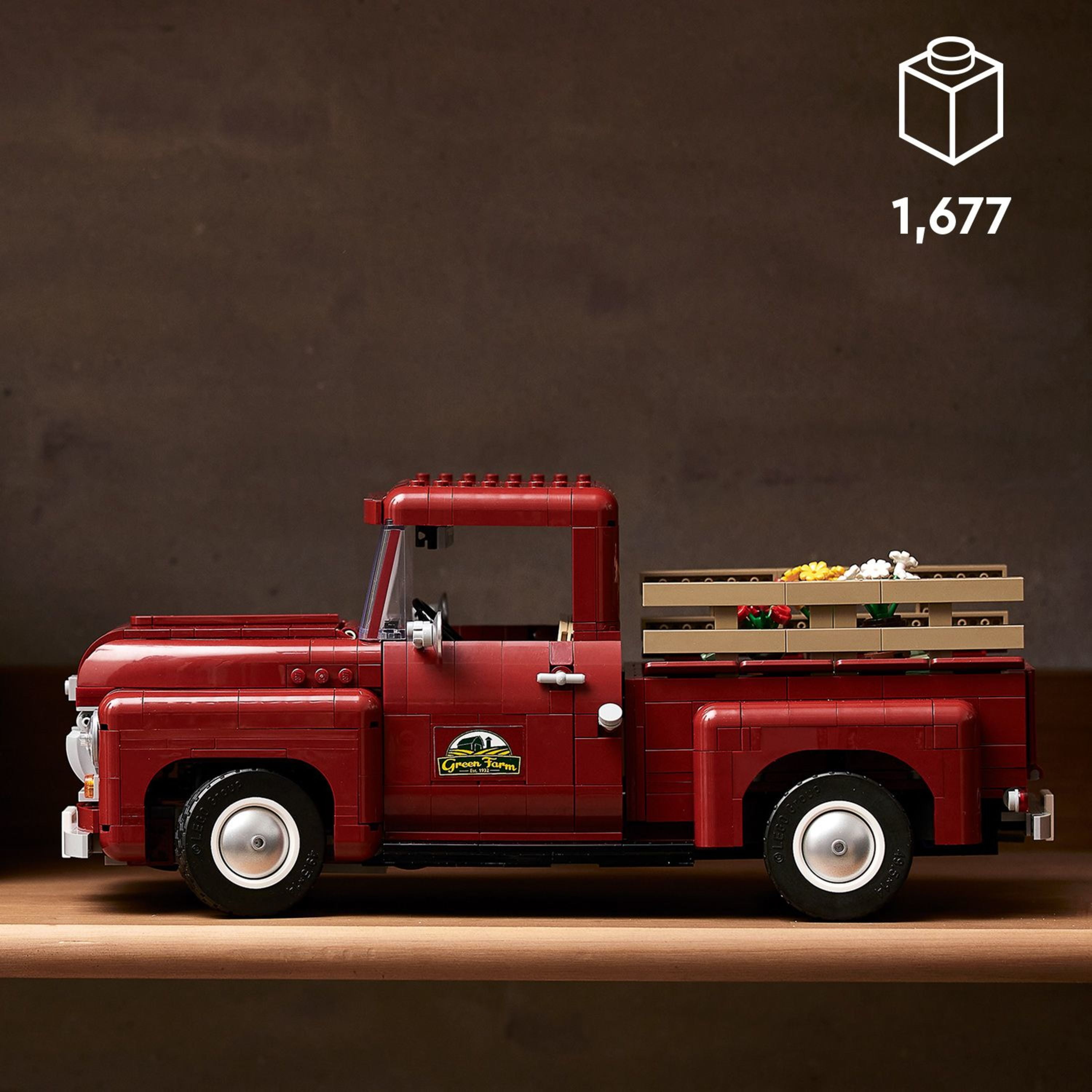 A perfect escape from modern life! Get ready to travel back to the 1950s with this LEGO Pickup Truck (10290) building set for adults. Packed with details, this true-to-life model truck recreates the vintage pickup truck shape with its rounded lines. Explore the model to discover realistic pickup truck features like a step-side bed, opening doors, tailgate, and removable wooden side railings. This truck is hard at work all year round, delivering produce from Green Farm. Create a seasonal display with the many accessories included. There’s a wheelbarrow with flowers and a watering can for spring. For summer there are 2 wooden crates, tomatoes, carrots and a milk bucket. Autumn brings a crate of pumpkins, while for winter, there is a wreath and a festive gift. Love the journey! This set is part of a collectible series of LEGO buildable model kits for adults to build, should they appreciate beautiful design. It offers an immersive build and will make a top gift idea for any fan of vintage pickup truck models. Measures over 5.5 in. (14 cm) high, 13 in. (33 cm) long and 5.5 in. (14 cm) wide. Contains 1677 pieces.
