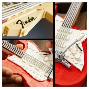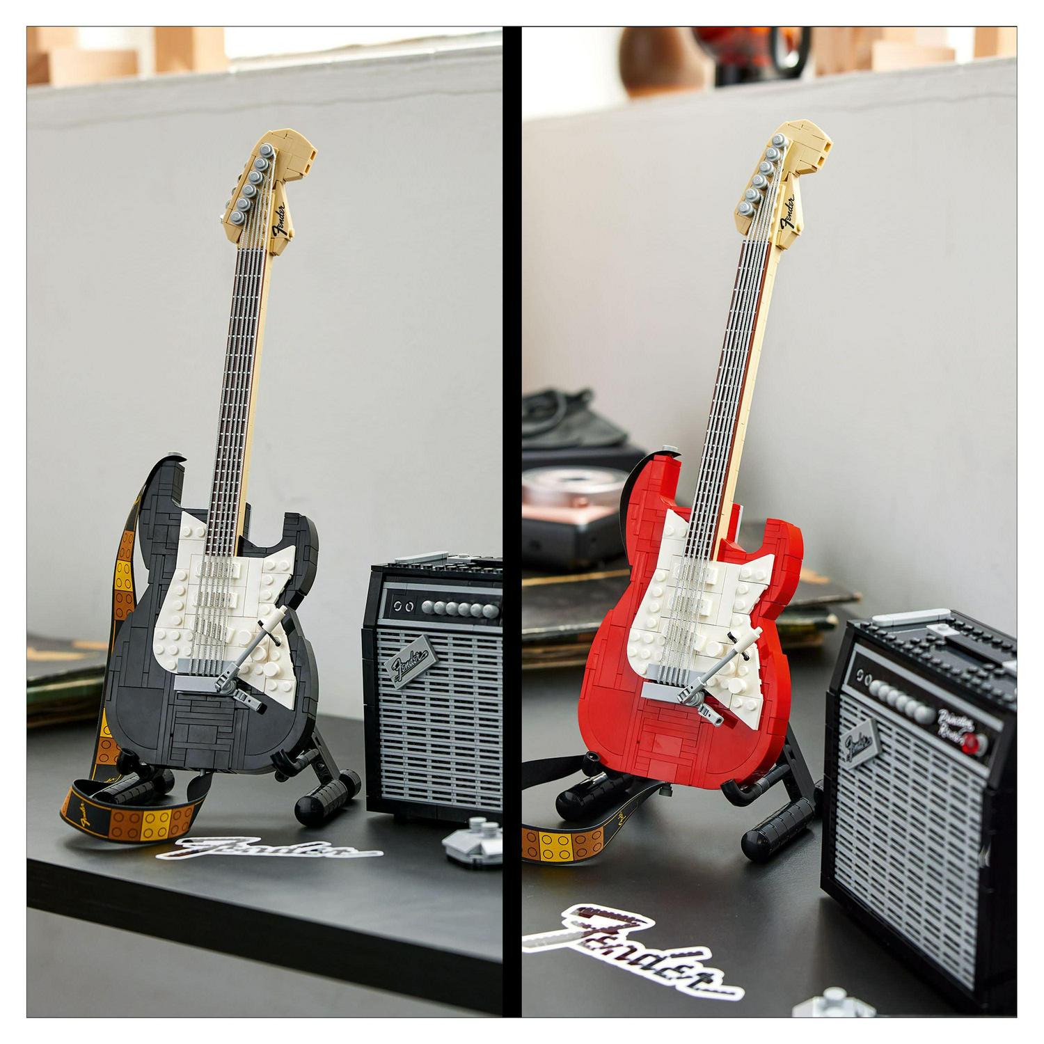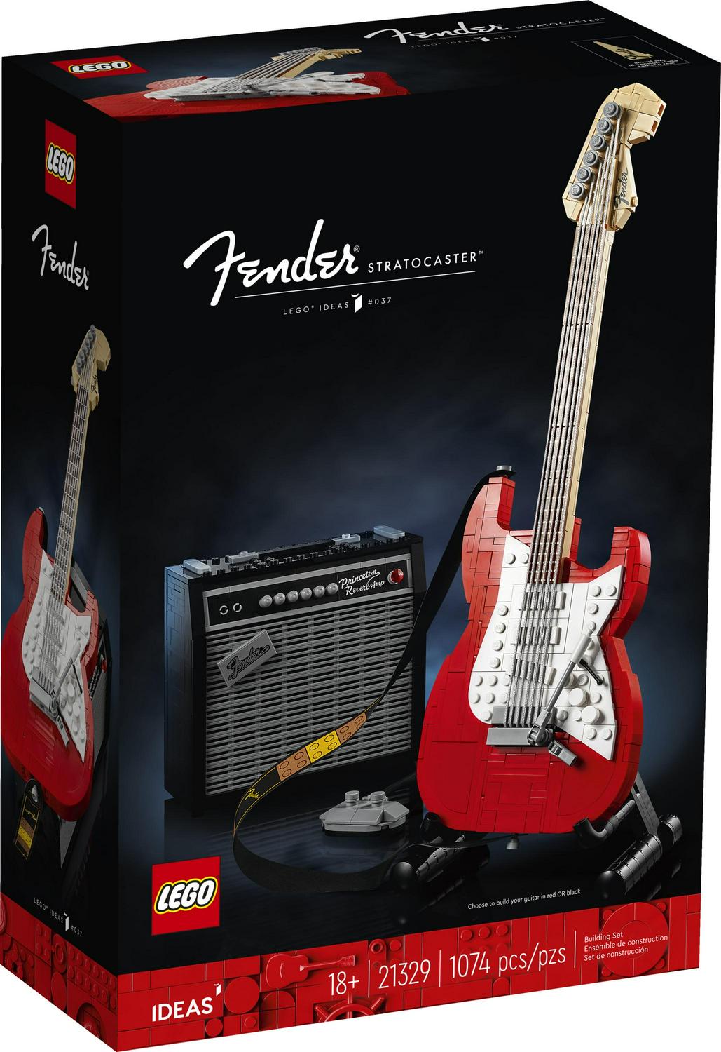 – This 1074-piece set comes with a booklet about the history of the Fender Stratocaster guitar, the set s fan designer and LEGO designers