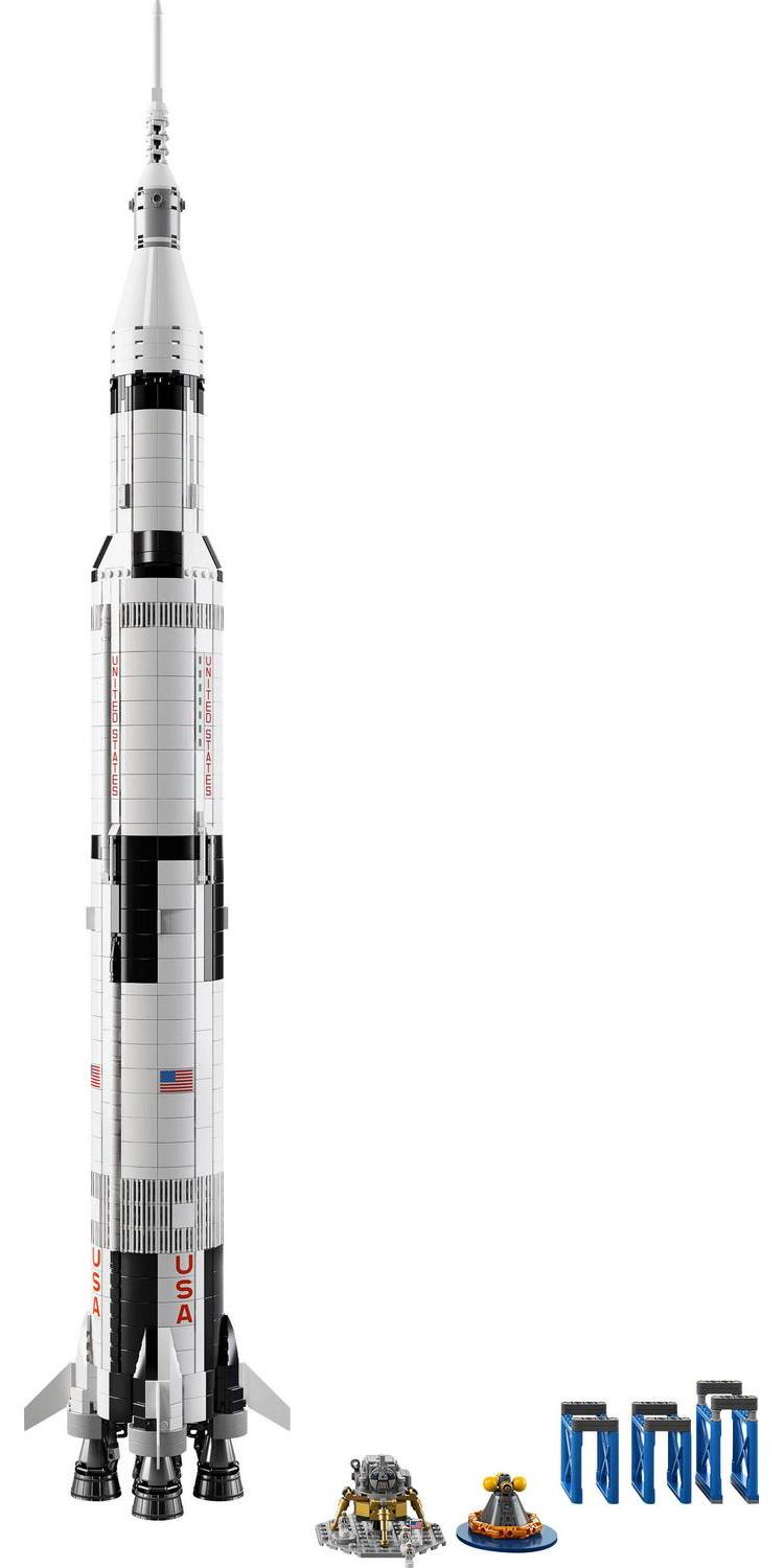 Display and role-play with this majestic meter-high (approximately 1:110 scale) LEGO brick model of the NASA Apollo Saturn V. Packed with authentic details, it features 3 removable rocket stages, including the S-IVB third stage with the lunar lander and lunar orbiter. The set also includes 3 stands to display the model horizontally, 3 new-for-June-2017 astronaut microfigures for role-play recreations of the Moon landings, plus a booklet about the manned Apollo missions and the fan designers of this educational and inspirational LEGO Ideas set.