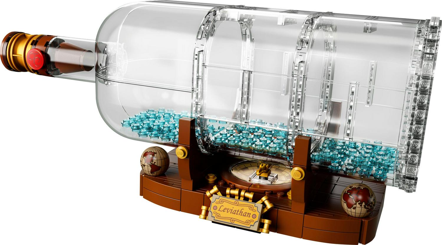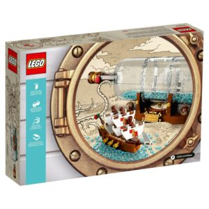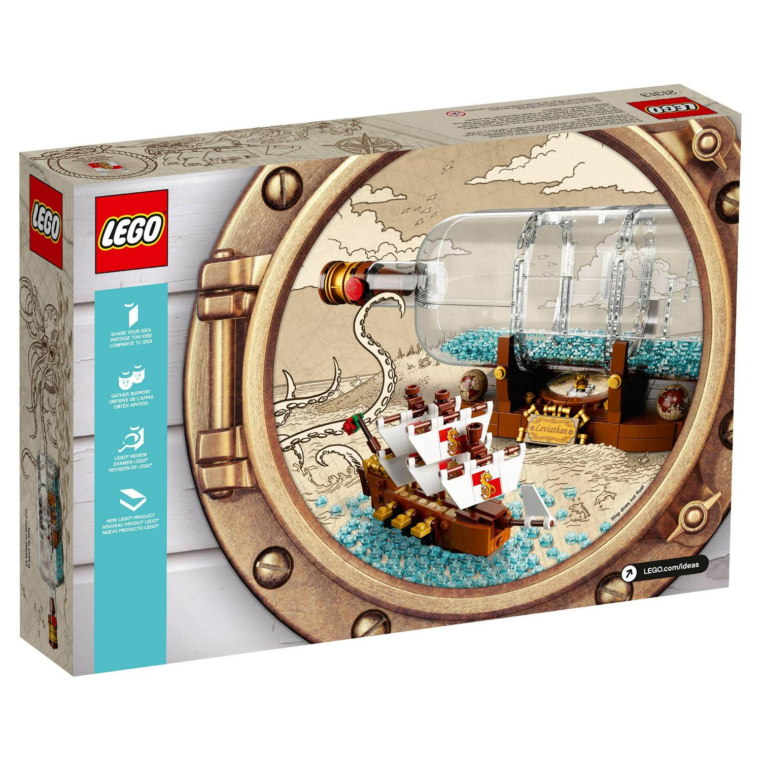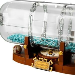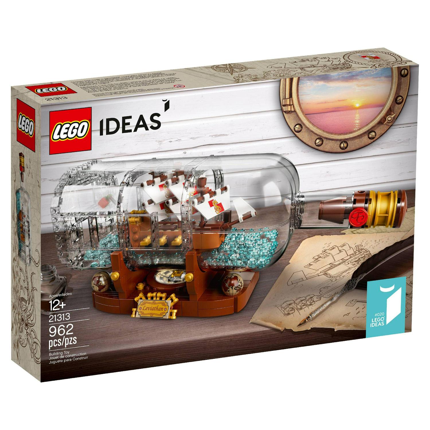Continue a nautical tradition when you build the LEGO Ideas 21313 Ship in a Bottle, featuring a highly detailed ship with the captain s quarters, cannons, masts, crow s nest and printed sail elements. Place the ship inside the LEGO brick-built bottle with a buildable cork, wax seal element and water-style elements inside, then display the model on the stand featuring the ship s Leviathan nameplate, built-in compass (non-functioning) with compass rose and spinning needle, and globe elements. This construction toy also includes a booklet about the fan creator and LEGO designers of this wonderfully nostalgic set.