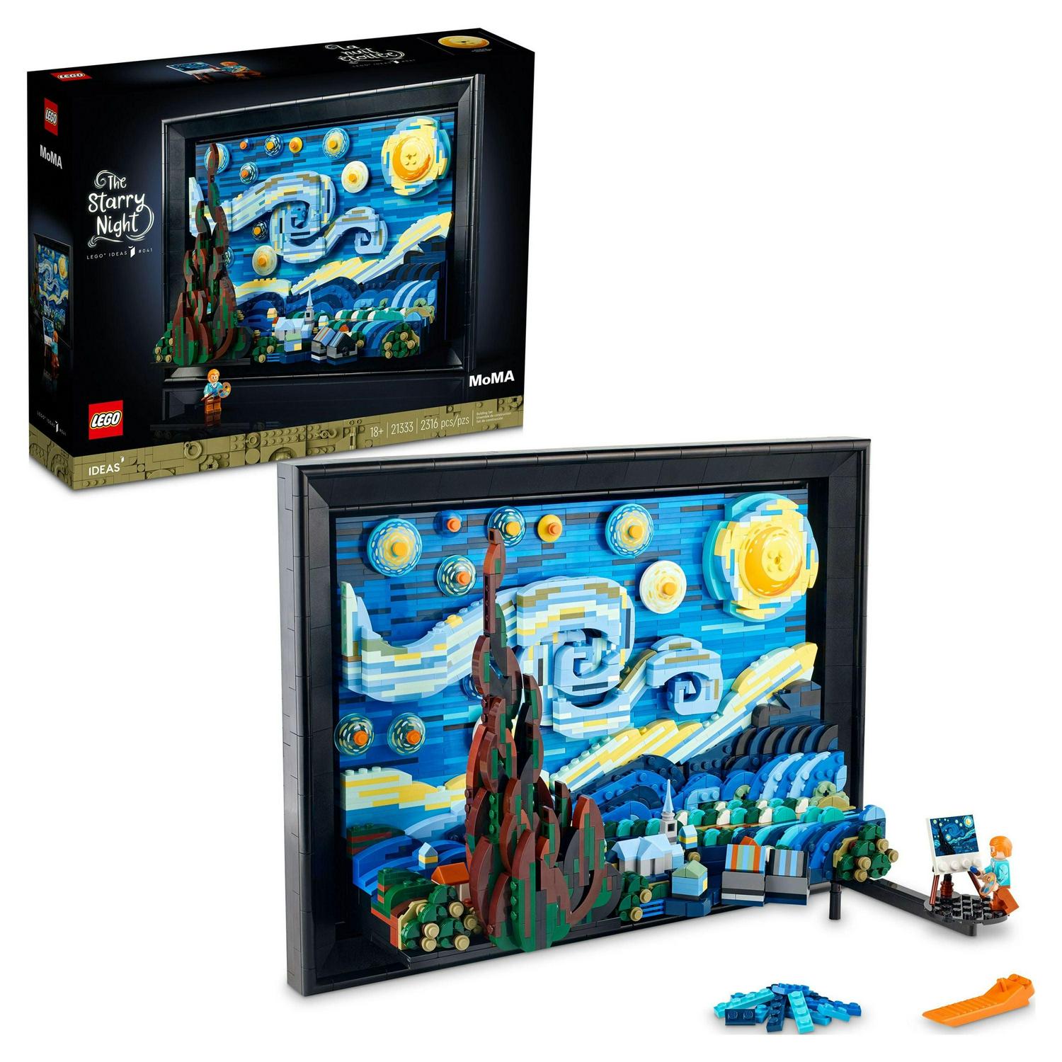 Build creativity. Build concentration. Build your own 3D LEGO brick version of one of Vincent van Gogh s most celebrated artworks, The Starry Night, with this wonderfully detailed LEGO Ideas model (21333). With this creative, home décor crafts set for adults, fans of the original work of art, which can be seen at The Museum of Modern Art (MoMA) in New York City, will discover innovative building techniques to capture Van Gogh s swirling brushstrokes. You will lose yourself in Van Gogh s dreamlike landscape, capturing the moon and stars, swirling clouds, rolling hills and the village below. Once you have your completed masterpiece, you can hang it by the hook on a wall or display it freestanding. There is also a Vincent van Gogh minifigure that can stand on an adjustable display arm with his paintbrush, palette and easel. A super treat for yourself or a home décor gift idea for other art lovers, this collectible model includes instructions to guide you every step of your immersive, creative crafts experience. Welcome to LEGO Sets for Adults a zone of zen where you can unwind with hands-on, mind-on DIY projects. Whatever your passion, there is a fascinating building set waiting for you. This LEGO brick Van Gogh art recreation measures over 11 in. (28 cm) high, 14.5 in. (38 cm) wide and 4.5 in. (12 cm) deep. Contains 2,316 Pieces.