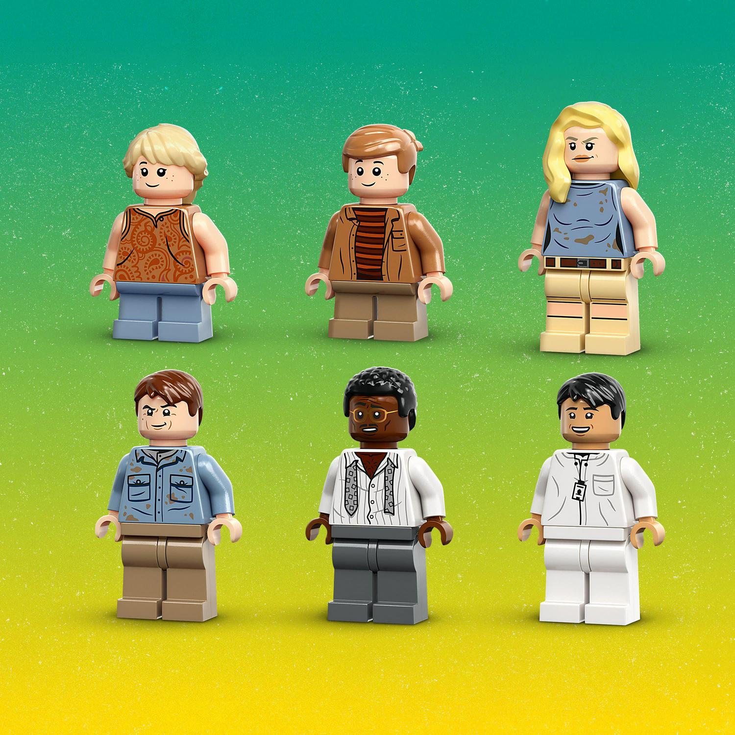 – 6 LEGO minifigures Dr. Ellie Sattler, Dr. Alan Grant, Ray Arnold, Dr. Henry Wu, Lex Murphy and Tim Murphy, plus brick-built, posable T. rex and Velociraptor toy figures and a T. rex dino skeleton figure