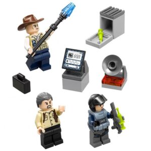 - Jurassic World toy includes 3 minifigures with assorted weapons and accessories: an ACU trooper, Hoskins and a vet