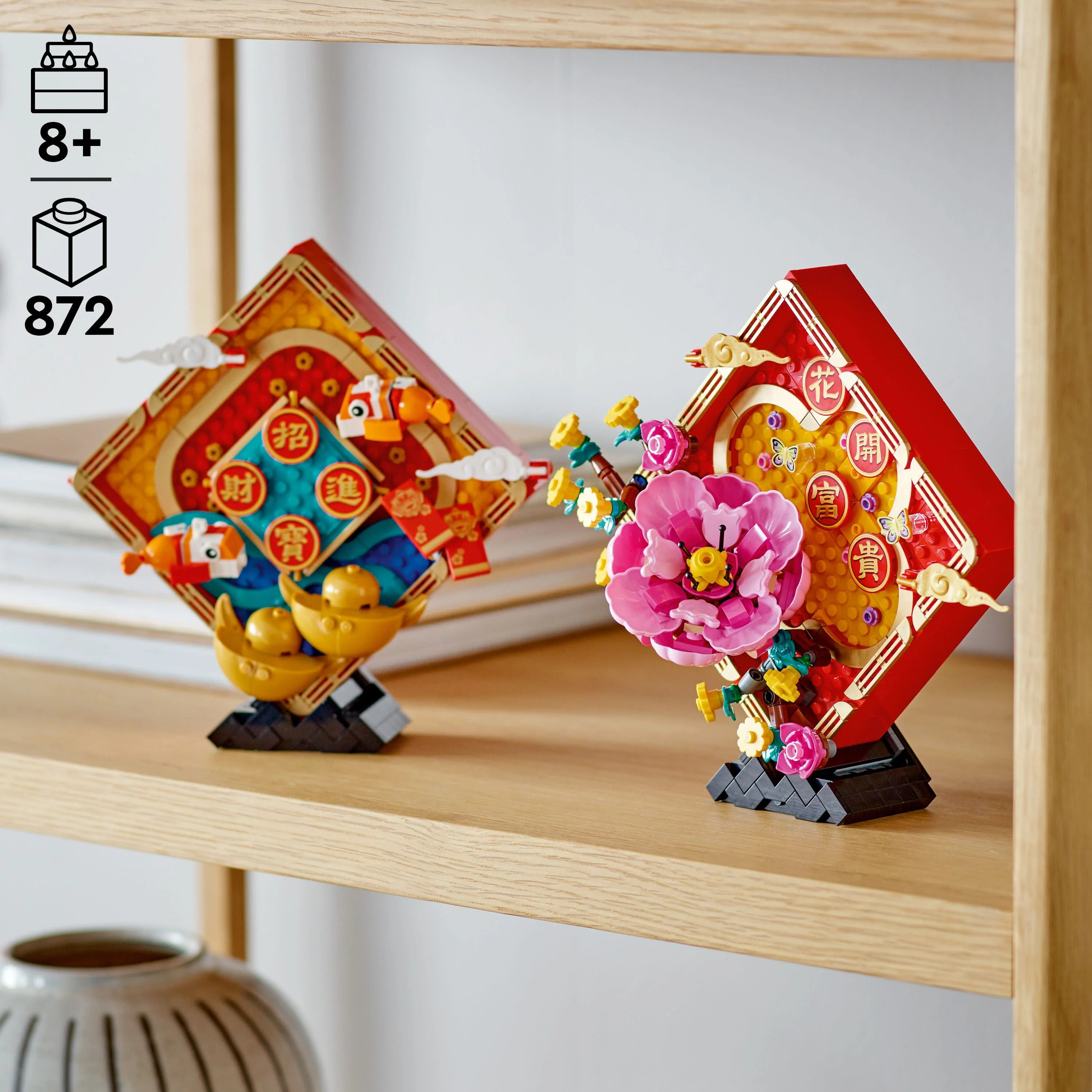 Lunar New Year Display (80110) – Capture traditional festive greetings symbolizing wealth, prosperity and happiness with 2 LEGO brick-built Lunar New Year decorations Model 1 – Features 2 buildable golden ingots in the traditional Yuan Bao design, the “Zhao Cai Jin Bao” greeting, 2 koi fish for good luck and 2 red pockets symbolizing good wishes and fortune Model 2 – Features a large buildable moutan peony flower and small buildable moutan peony flowers, plus the “Hua Kai Fu Gui” greeting, meaning blooming prosperity and happiness Gift idea for ages 8 and up – Give this 872-piece LEGO building set as a holiday gift to kids, friends and family at Lunar New Year Display individually or as a pair – Each of these buildable models measures over 8 in. (21 cm) high, 8 in. (21 cm) wide and 3 in. (8 cm) deep
