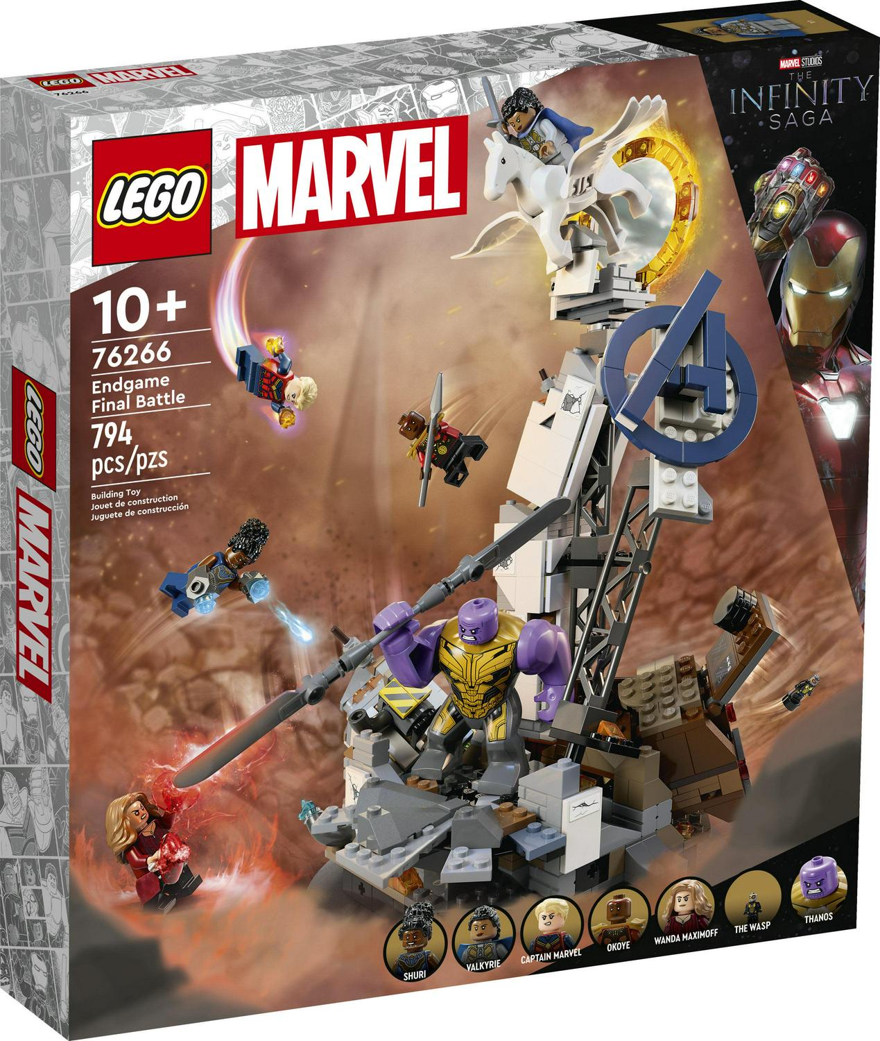 – Famous minifigures The Marvel playset includes Captain Marvel, Okoye, Wanda Maximoff, Shuri and Valkyrie minifigures, plus a Thanos big figure and The Wasp microfigure
