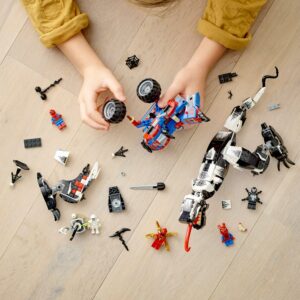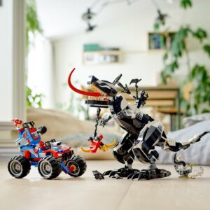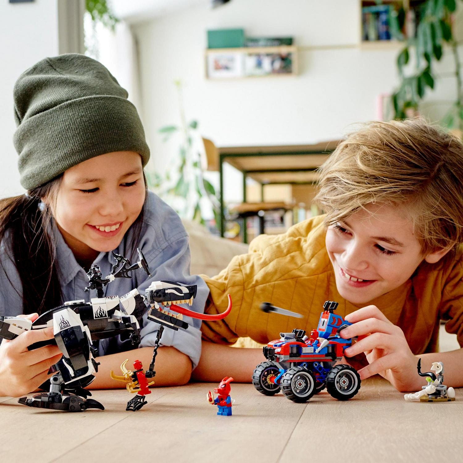 – The creative play intensifies when your youngster places the Venom minifigure into the Venomosaurus, with its vicious jaws and black web-weapons, and puts Spider-Man into his vehicle with its awesome weapons and super-suspension
