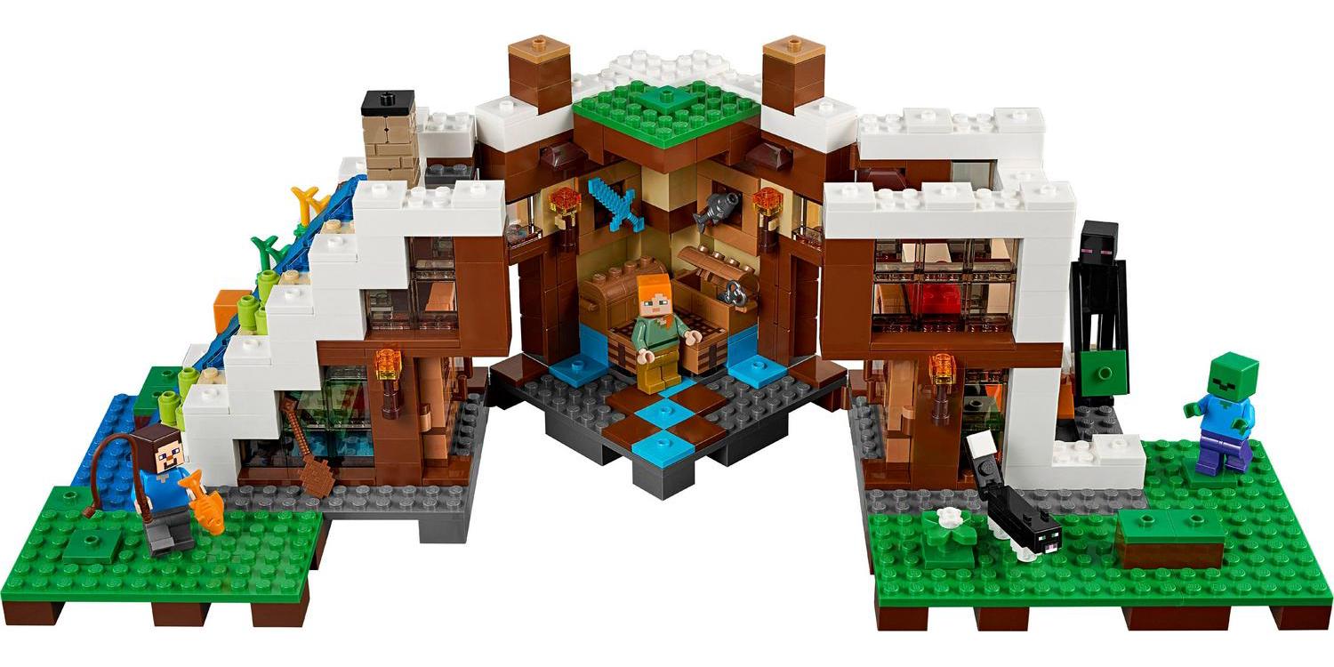 – Build a LEGO Minecraft waterfall base with a roof garden, secret lava entrance, and four doors!