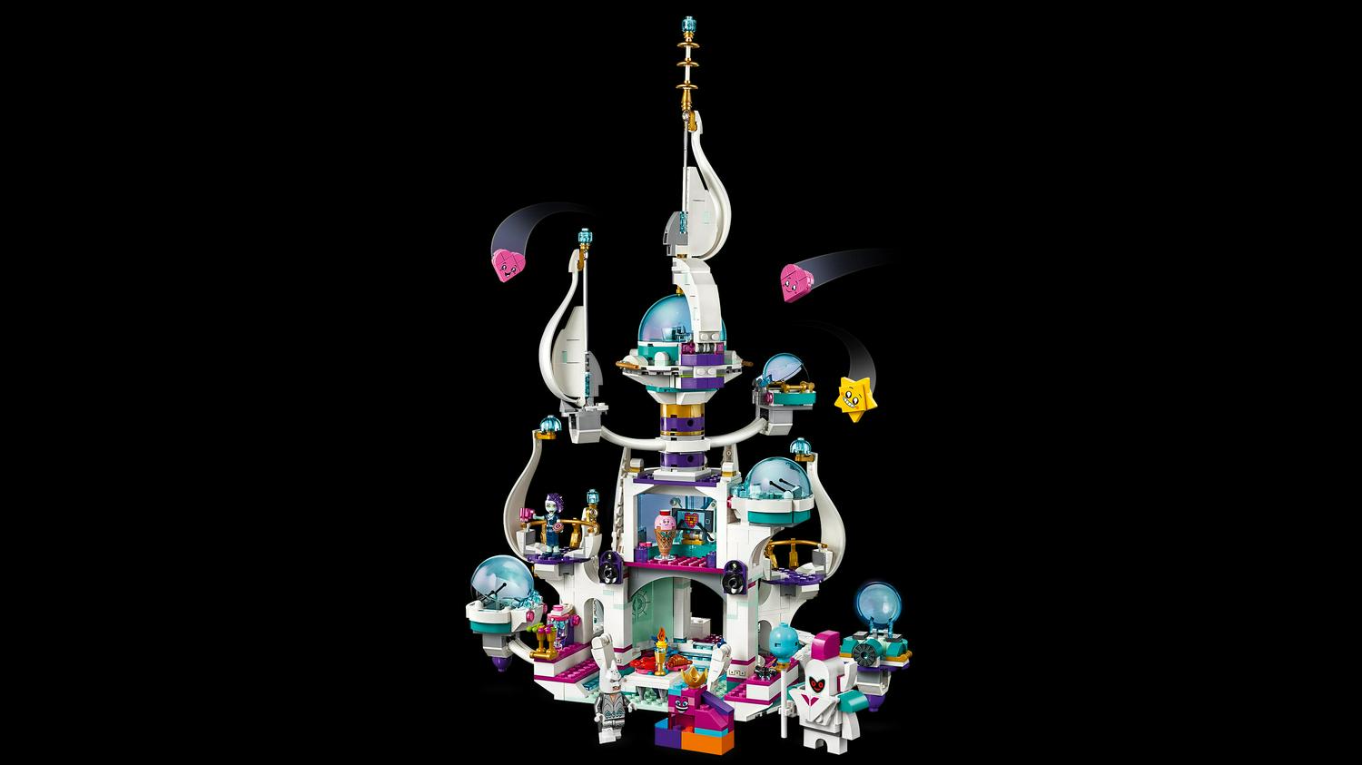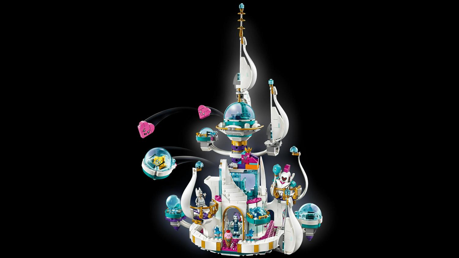 – This LEGO palace set includes 9 characters from THE LEGO MOVIE 2 : a Bachelor Batman minifigure and Celeste mini-doll figure, plus Queen Watevra Wa’Nabi, Ice Cream Cone, Star, Royal Guard and 2 Heart brick-built figures