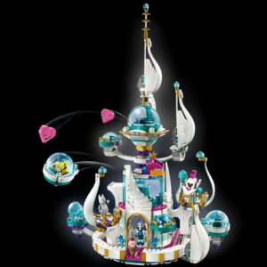 – The multi-level palace toy features a rotating top section with an opening, detachable rocket for Queen Watevra Wa’Nabi, detachable opening pods for other characters, 2 balconies, security room with a buildable security screen and assorted elements including a coffee cup, small heart and donut, and a dining room with a table, 2 seats, sideboard, buildable smoothie maker, assorted food and drink elements and a DJ booth