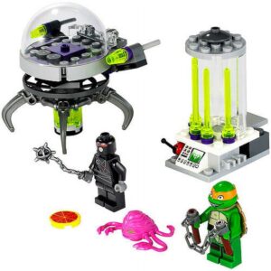 Give the villains the slip with a hot slice of turtle power with this LEGO Ninja Turtles Set! The Kraang has Michelangelo locked tight in a laser-shield prison inside his lab. Use Michelangelo’s leftover pizza to turn a sticky situation into a slick escape! Slide the pizza through the prison bars to make the Foot Soldier slip and fall! Then activate the explosion function on Michelangelo’s cage to escape! Once he’s free, battle The Kraang in his awesome mech walker with dual laser flick missiles. Be ready for a wild ride through the city sewers when The Kraang detaches the mech walker’s legs to create a flying escape pod! Don’t let him get away!