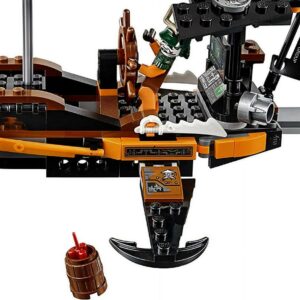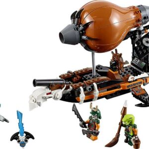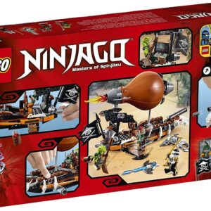 The Raid Zeppelin airship features a spring-activated pirate cannon, 2 stud shooters, anchor-shaped fold-out wings, trapdoor function to drop a barrel of dynamite (or minifigures), adjustable pirate flag and translucent fire elements,Weapons include a translucent dark-blue Djinn Blade with ‘trapped Jay’ element, Zane’s 2 golden katanas and 2 golden shurikens, Doubloon’s 2 pirate swords and Clancee’s broomstick,Includes 3 minifigures: Zane, Doubloon and Clancee,Raid Zeppelin measures over 5″ (15cm) high, 11″ (29cm) long and 6″ (16cm) wide,Zane’s flyer measures over 3″ (1cm) high, 1″ (5cm) long and 4″ (11cm) wide