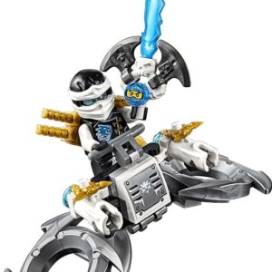Stage an aerial conflict between Doubloon’s Raid Zeppelin airship and Zane’s flyer. The Zeppelin is armed with a firing front cannon, 2 stud shooters and has a trapdoor function to drop barrels of dynamite (and captured Ninja warriors!). Retaliate by firing the flyer’s elemental ice stud shooters and battle for the special Djinn Blade with ‘trapped Jay’ element. Includes 3 minifigures: Zane, Doubloon and Clancee.