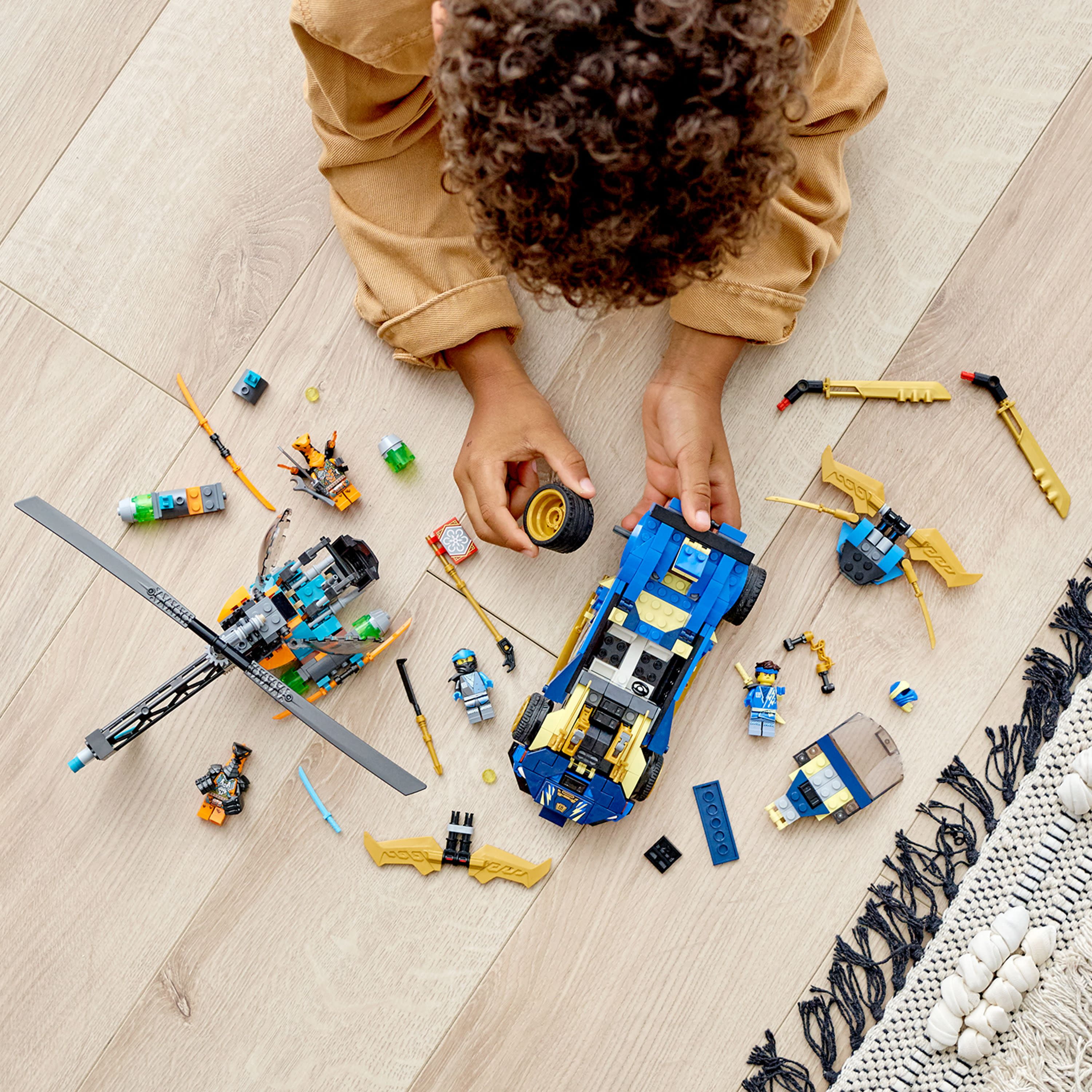 Kids can role-play battles in the air or on the ground with this LEGO NINJAGO Jay and Nya’s Race Car EVO and helicopter set with 3 vehicles This set comes with 3 vehicles: a LEGO Ninjago race car featuring a detachable flyer, and an armored toy helicopter with rotating blades Includes 4 LEGO NINJAGO minifigures: Jay with a sword, Nya with a spear, plus snake warriors Cobra Mechanic with a sword and Boa Destructor When kids complete their mission and defeat the snake warriors, they are rewarded with a Teamwork banner to display on the car Look out for banners in 7 other sets, including Ninja Dojo Temple 71767, Kai’s Fire Dragon EVO 71762 and Ninja Ultra Combo Mech 71765 Using the free LEGO Building Instructions app, builders can zoom, rotate and visualize the model on their smartphones and tablets NINJAGO toys make fantastic birthday gifts for kids 7 + years old who are into ninjas, racing cars and other vehicles!