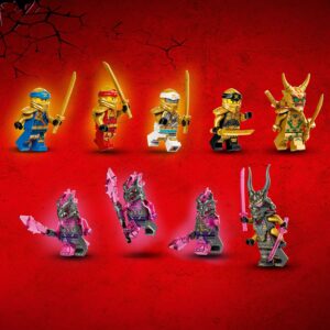 – Features 9 NINJAGO minifigures, including an exclusive Golden Oni Lloyd and all Golden Kai, Jay, Cole and Zane, all with golden swords