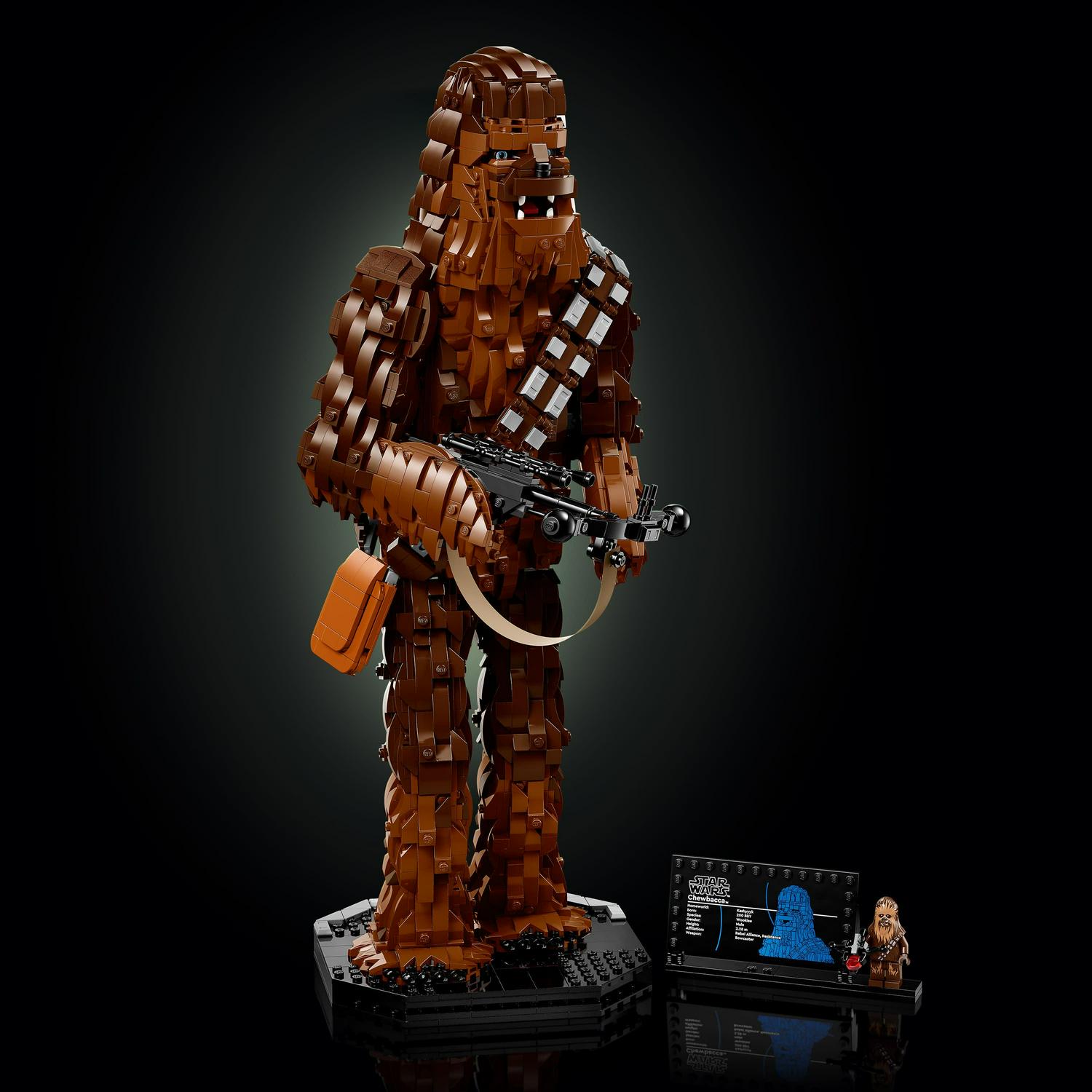 – Designed for display The buildable, non-posable Chewbacca LEGO figure holds a brick-built bowcaster and has a built-in display stand, plus a plaque with information about the character