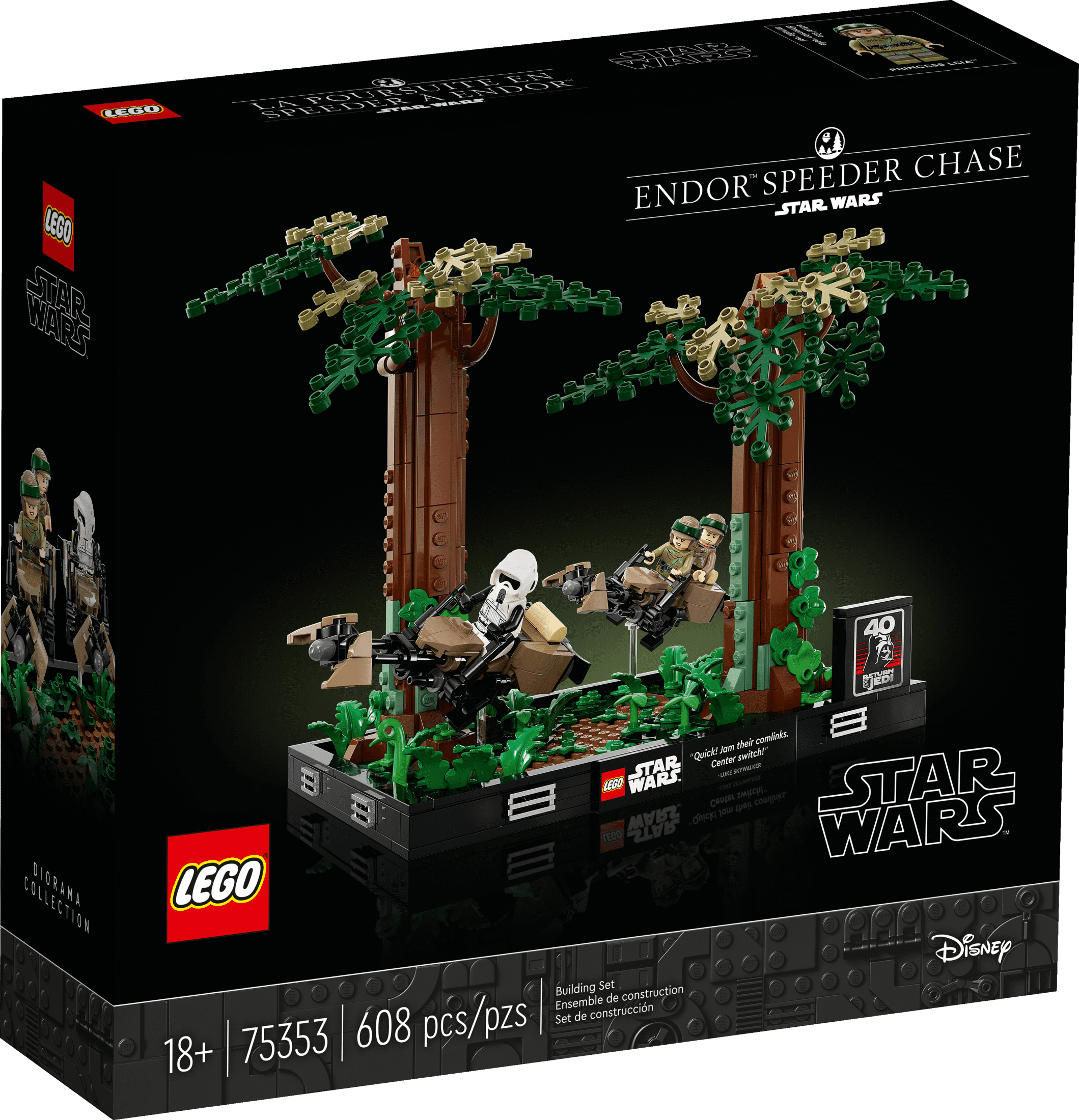 Create a dynamic LEGO brick-built snapshot of the iconic speeder chase through the forests of Endor from Star Wars: Return of the Jedi with this detailed Endor Speeder Chase Diorama (75353) Celebrate the Original Star Wars Trilogy with 3 LEGO Star Wars Minifigures, including Princess Leia and Luke Skywalker in Endor outfits and a Scout Trooper. Luke has a green lightsaber while Leia and the Scout Trooper each have a blaster Build authentic details such as 2 speeder bikes (1 for Leia and Luke and 1 for the Scout Trooper) with transparent elements to pose them at dynamic angles, 2 buildable trees, fern elements and a plaque marking the 40th anniversary of Star Wars: Return of the Jedi Grow your collection with this set, which is part of a series of collectible, buildable LEGO Star Wars diorama models that depict iconic Star Wars moments Treat yourself or give this buildable set for adults as a holiday gift or graduation present to a friend with a passion for classic Star Wars or a collector of LEGO Star Wars dioramas This buildable Star Wars display model great for dorm room or home decor measures over 8 in. (20 cm) high, 11 in. (28 cm) wide and 7 in. (18 cm) deep. Contains 608 pieces