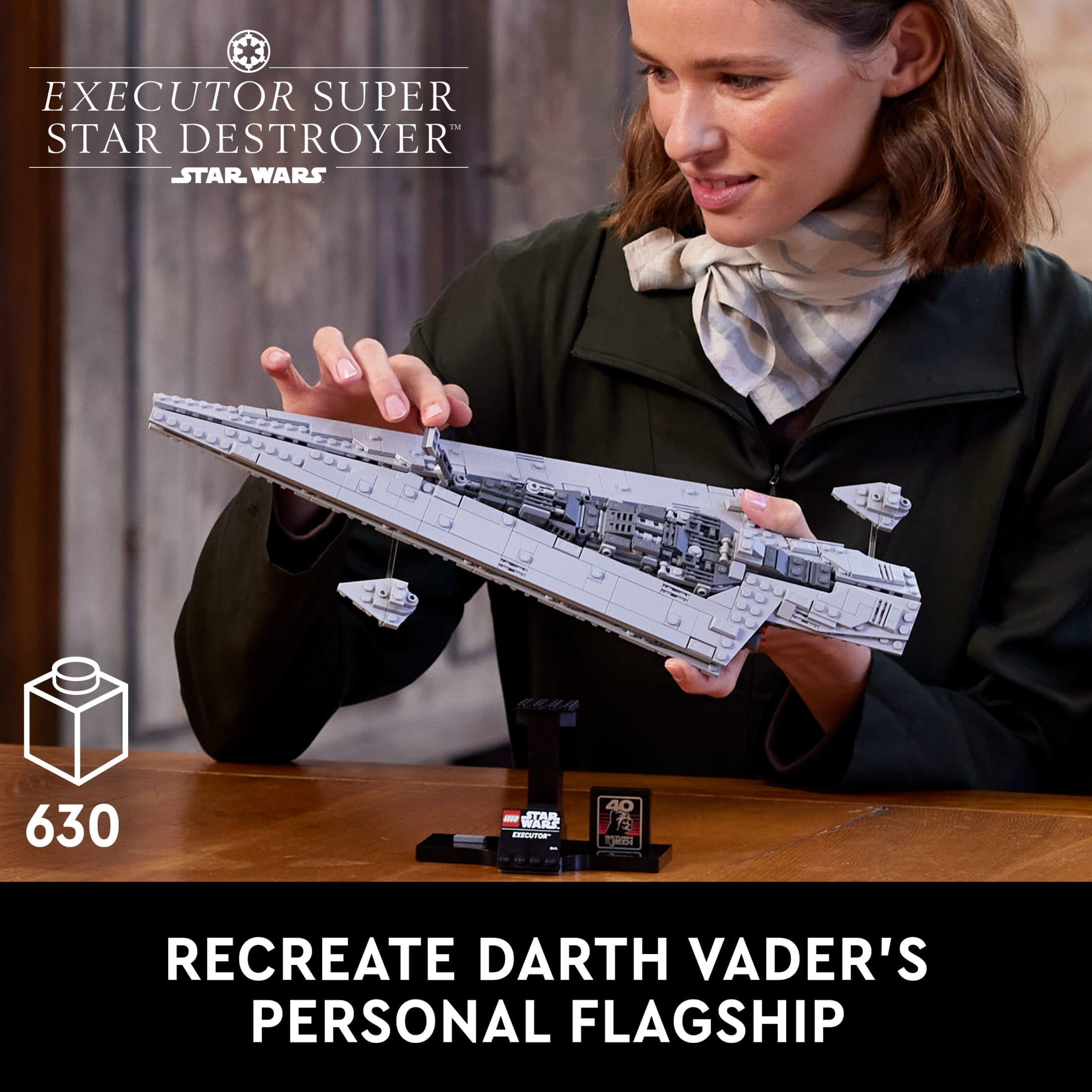 Showcase your Imperial creativity with this highly detailed LEGO Star Wars replica of Darth Vader’s Executor Super Star Destroyer (75356) from the classic Star Wars trilogy Includes 2 Star Destroyers to ‘fly’ alongside Darth’s Vader’s flagship. Attach the 2 brick-built models of Star Destroyers with translucent elements to show the scale of one of the largest Imperial starships ever created Display the Executor Super Star Destroyer on the buildable stand with a nameplate and Star Wars: Return of the Jedi 40th anniversary plaque Treat yourself or give this 630-piece build-and-display model as a birthday or holiday gift to another adult Star Wars fan or experienced LEGO builder From a galaxy far, far away to your living room! Collectible LEGO Star Wars building sets for adults are designed for creative people like you who enjoy fun, hands-on projects to unwind Download the LEGO Builder app for a convenient way to store your building instructions and keep track of your builds with tools to zoom in and rotate models in 3D