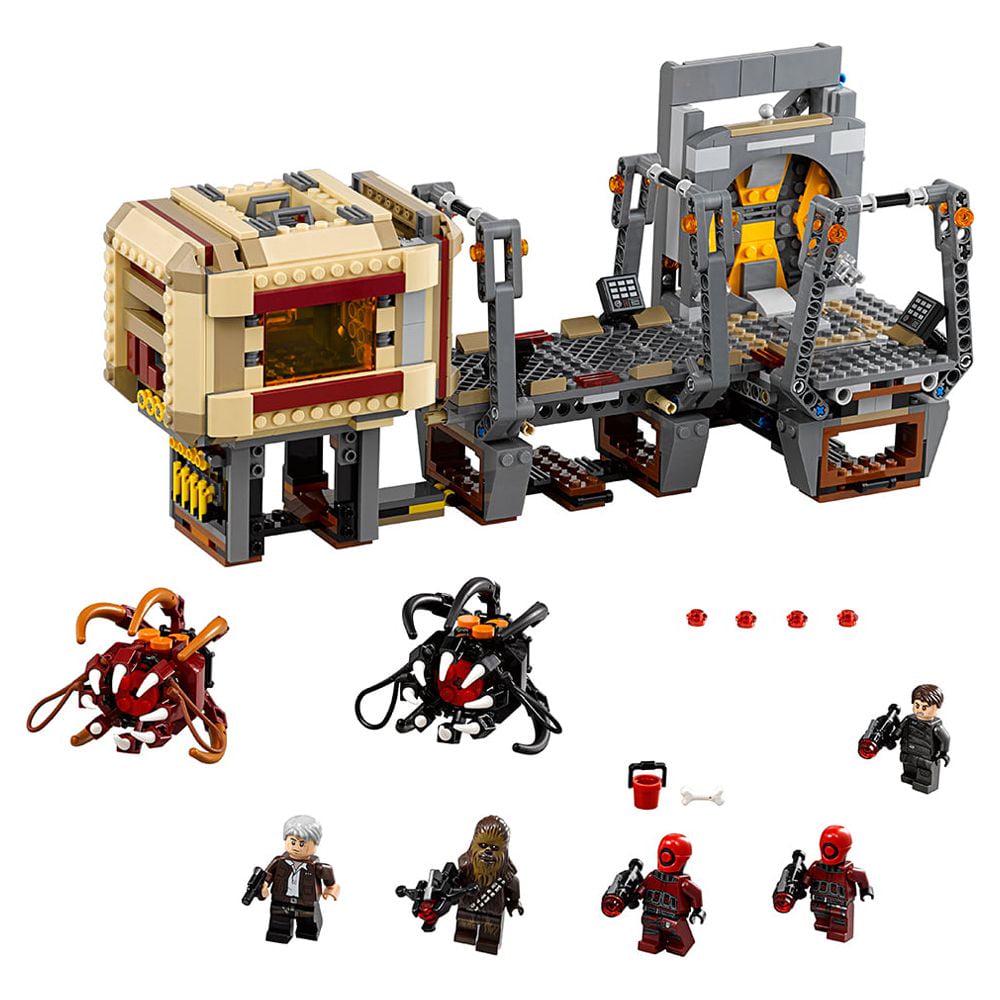 Recreate epic scenes from Star Wars: The Force Awakens, as Han Solo and Chewbacca try to escape the clutches of Bala-Tik and his Guavian Security Soldiers aboard their freighter. Featuring a modular design for easy reconfiguration, the freighter sections contain authentic details like a lowering blast door, trapdoor and crawlspace in which to hide. Pull the correct fuse to release the 2 buildable Rathtar figures with posable tentacles and teeth, then rearrange the sections and play out another Rathtar escape! This great set includes 5 minifigures.