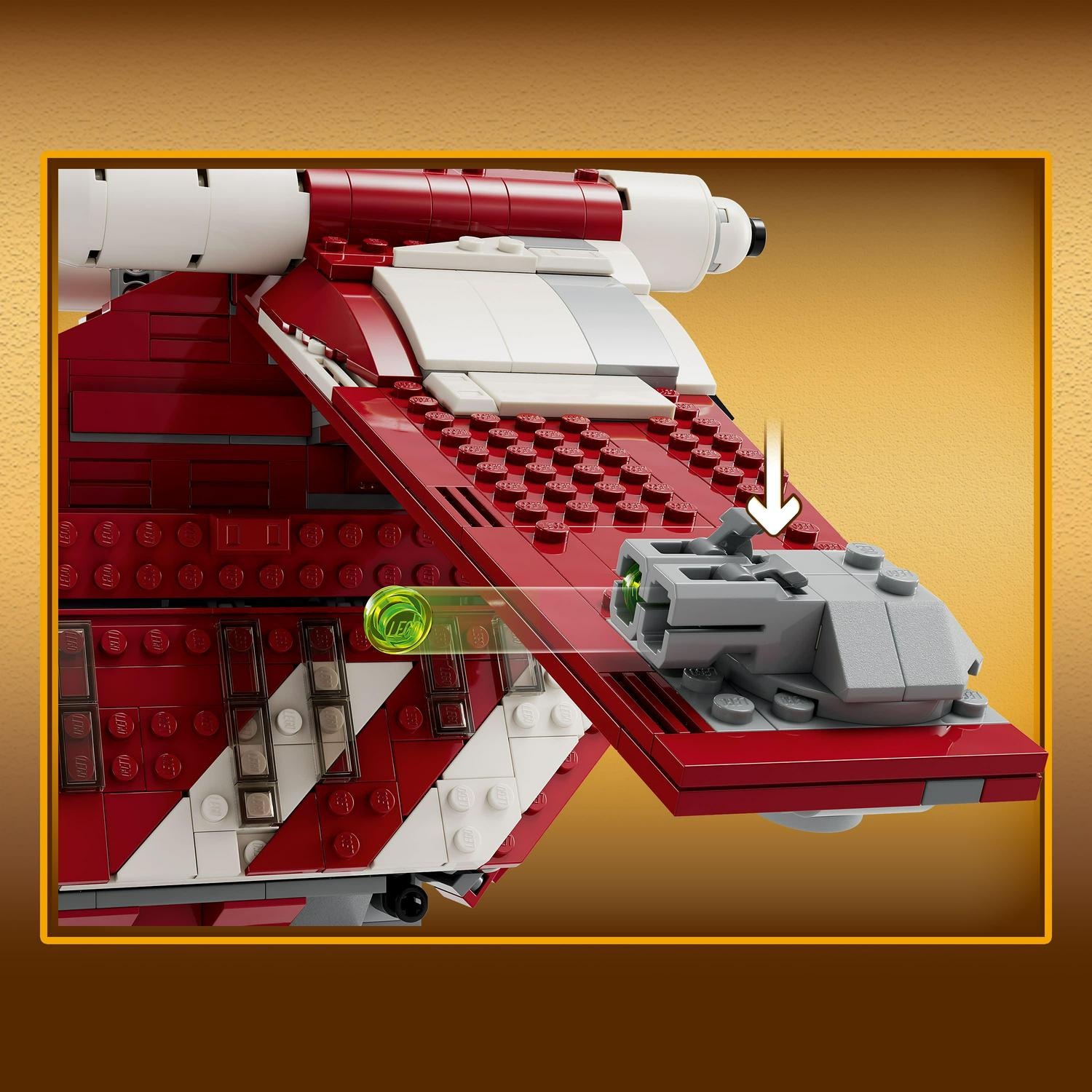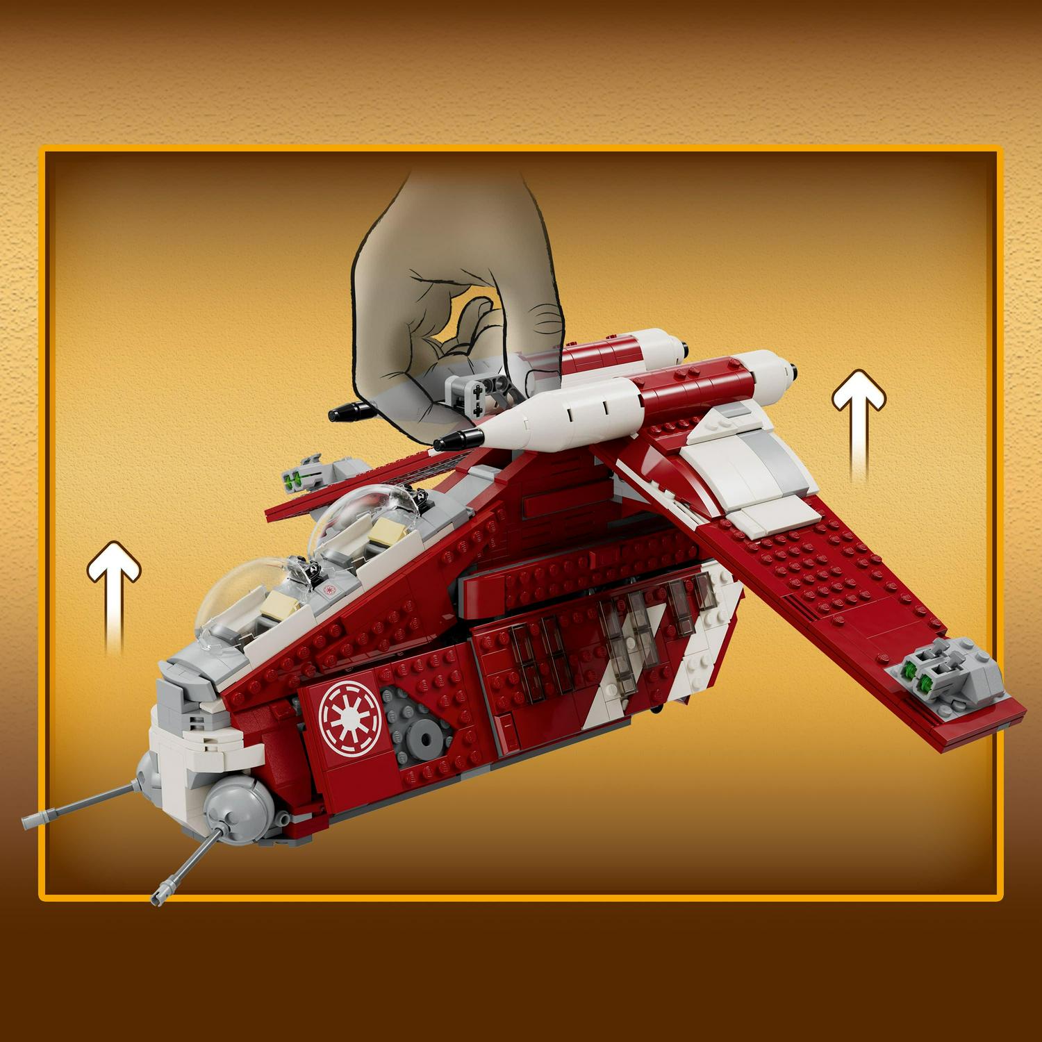 – Designed for aerial battles The Coruscant Guard Gunship features 2 pilot cockpits, 2 stud shooters, 2 adjustable cannons and a handle for easy flying