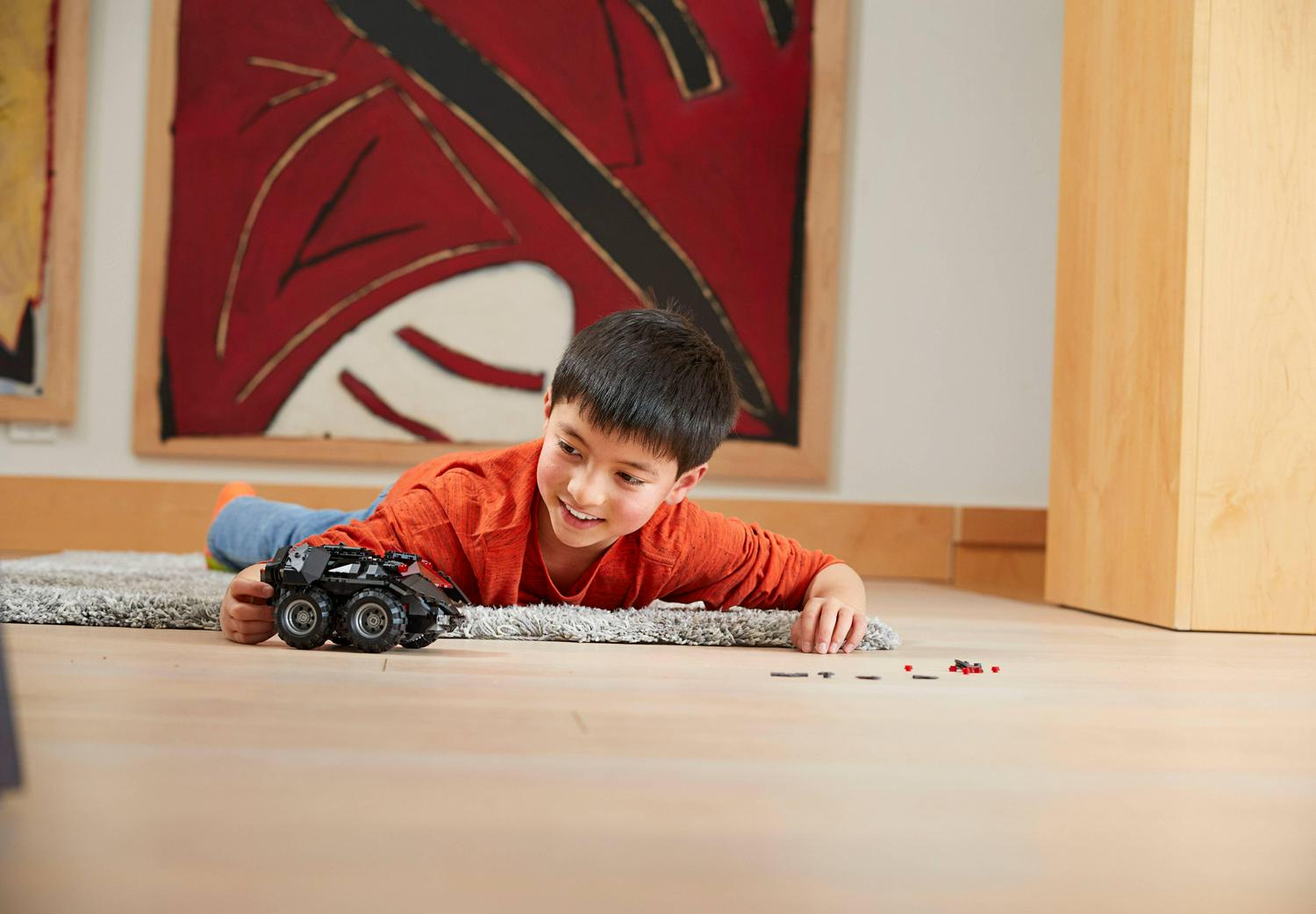 Speed to Gotham City crime scene to take down the Joker and other DC toy villains with the motorized LEGO DC Super Heroes 76112 App-Controlled Batmobile. This buildable superhero car toy features 2 motors powered by a Bluetooth-controlled battery hub, an opening cockpit for Batman, 4-wheel drive and 2 dual stud shooters. Simply download the app to control the Batmobile from your smartphone or tablet.