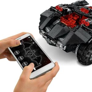 – This motorized Batmobile superhero toy features 2 motors powered by a Bluetooth-controlled battery hub, an opening minifigure cockpit, 4-wheel drive and 2 dual stud shooters