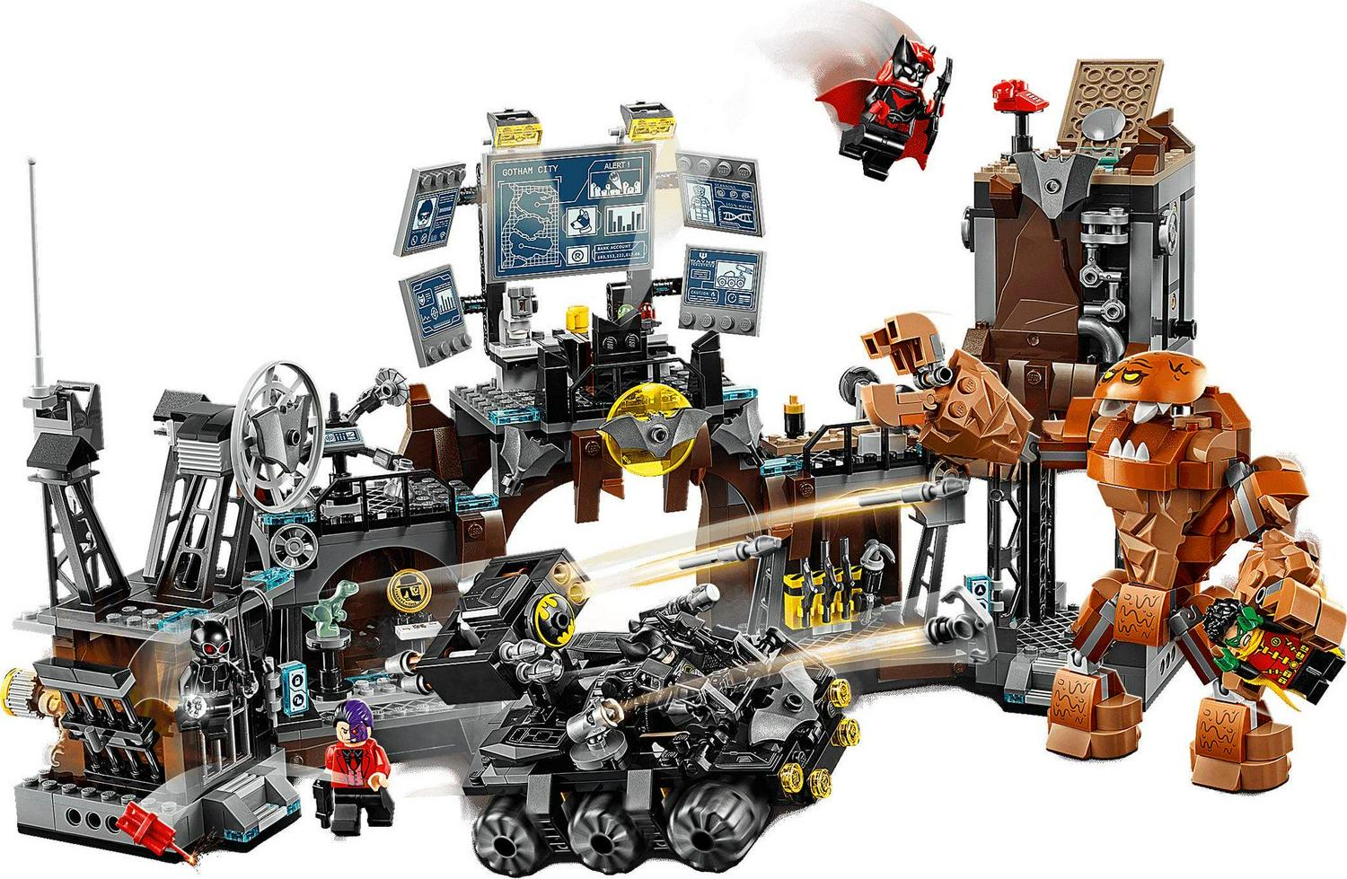 – This LEGO Batman superhero toy playset includes 6 minifigures: Batman, Bruce Wayne, Robin, Batwoman, Catwoman and Two-Face, plus a posable, Clayface big figure with snapping jaws and gripping hands that can hold a minifigure