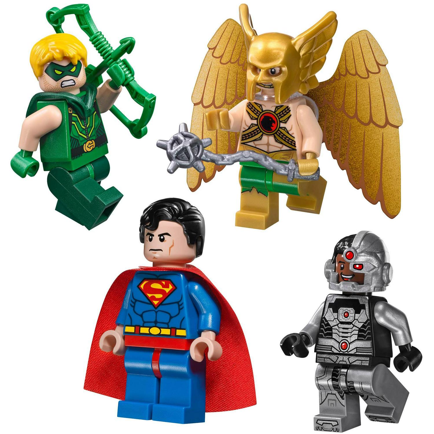 – The Darkseid Invasion LEGO Super Heroes Set includes 4 minifigures with assorted weapons and an accessory: Superman, Green Arrow, Cyborg and Hawkman, plus a Darkseid figure