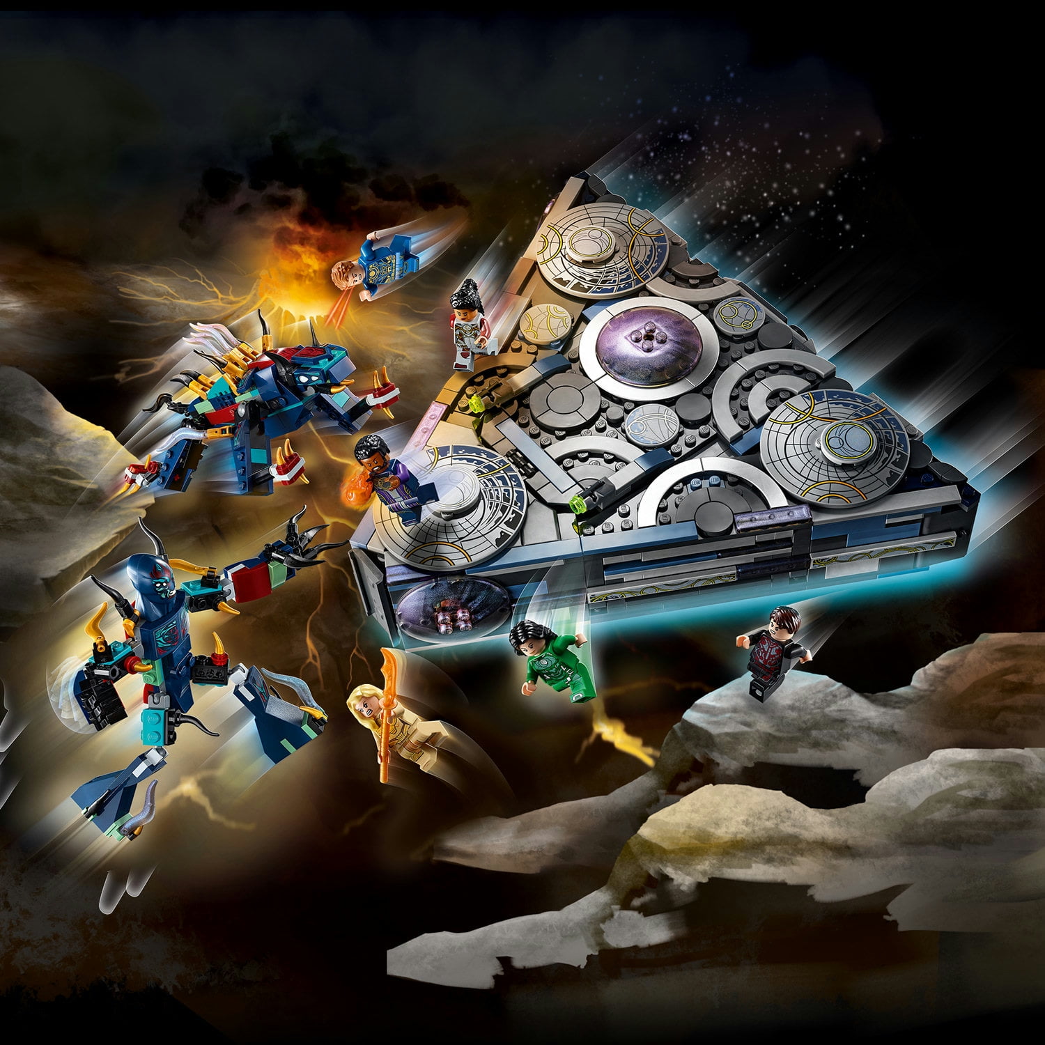 LEGO Marvel Rise of the Domo (76156) lets kids explore the detailed interior of the Eternals’ spaceship then recreate the final battle with 6 superhero minifigures and 2 evil Deviants. Spaceship building toy and superhero battles If you’re looking for a new toy for a youngster, they’ll love this warship battle playset. Kids join 6 Eternals – Makkari, Ikaris, Thena, Sersi, Druig and Phastos – and explore their amazing spaceship. The 3 sides lift open to give access to the cockpit, weapons room, laboratory and more. But when the evil leader of the Deviants arrives with his accomplice, kids must use the spaceship to overcome the Deviants! If you’re buying for a minifigure fan, this is the only LEGO playset to feature the Druig and Phastos minifigures! Marvel Studios’ The Eternals playsets – Top superhero toys LEGO Marvel The Eternals brick building toys are action playsets with cool minifigures that inspire young imaginations and make ideal Christmas and birthday gifts.