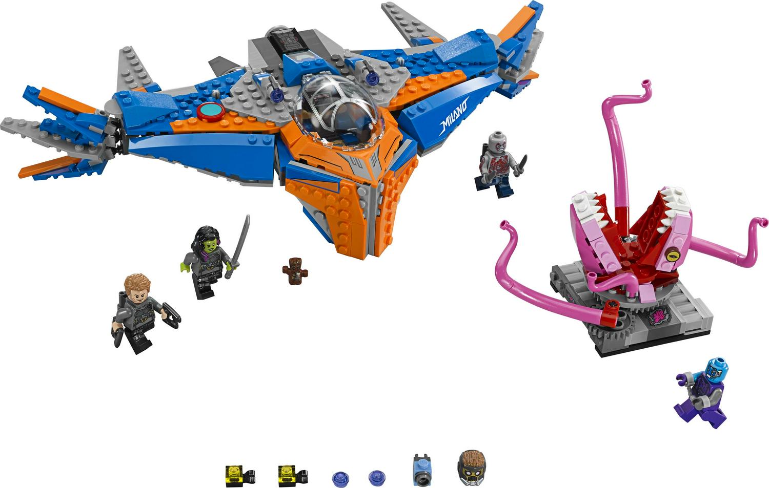 The LEGO Marvel Super Heroes Guardians of the Galaxy the Milano vs the Abilisk is a set of minifigures of Star Lord, Nebula, Drax, and a Groot figure.Zoom in with the Milano and steal the Annulax batteries from the Abilisk. Fly all 4 minifigures and Groot in the Milano and shoot studs at the Abilisk. Move the tentacles of the monster with a handle to fight back.Other accessories include Star Lord s 2 blasters and jetpack, Gamora s sword, Drax s twin daggers, 2 Annulax batteries, Nebula s handcuffs, and Groot s boombox.Create your own scenes from Guardians of the Galaxy Vol 2 and have an action packed adventure with the LEGO Marvel Super Heroes Guardians of the Galaxy the Milano vs the Abilisk.