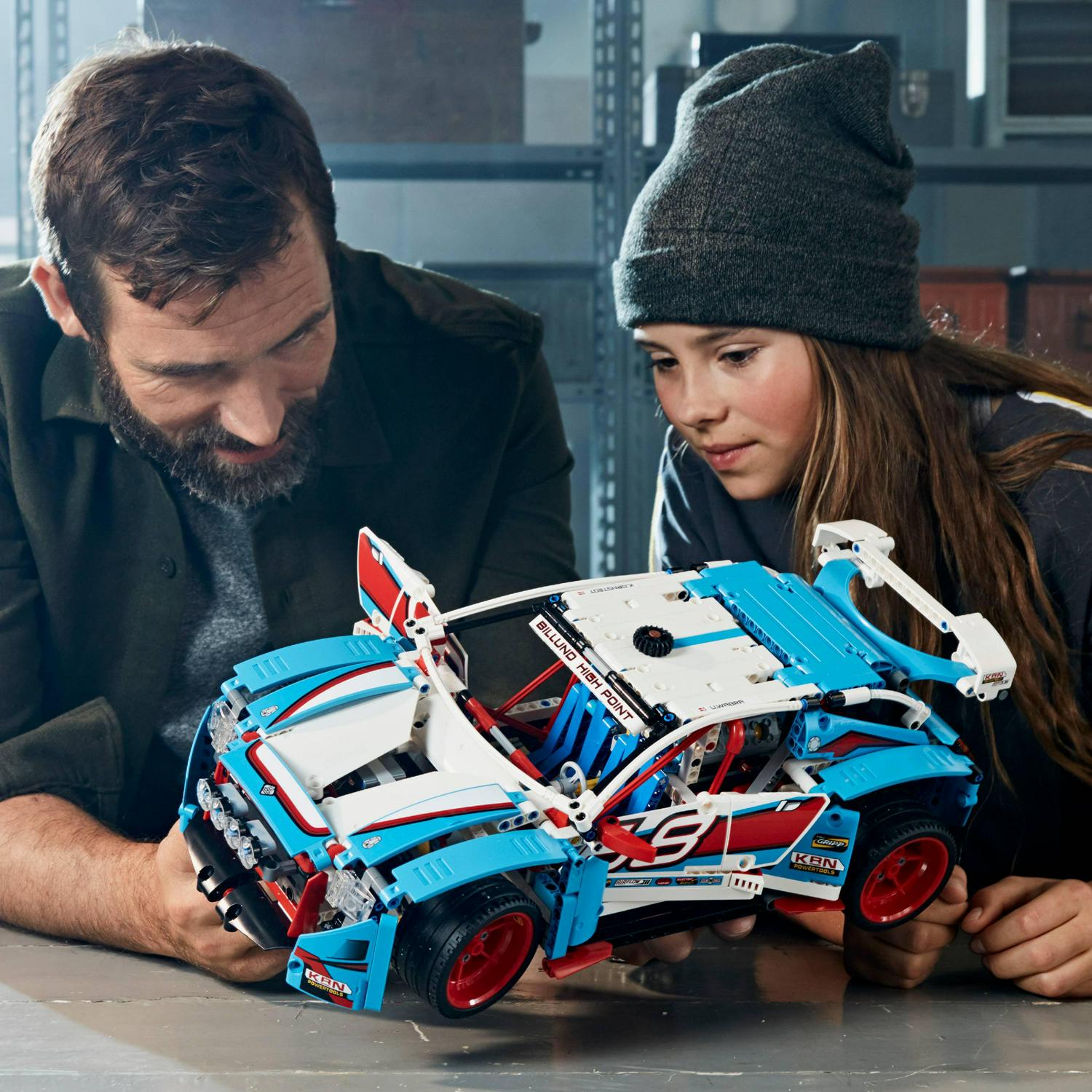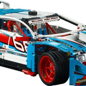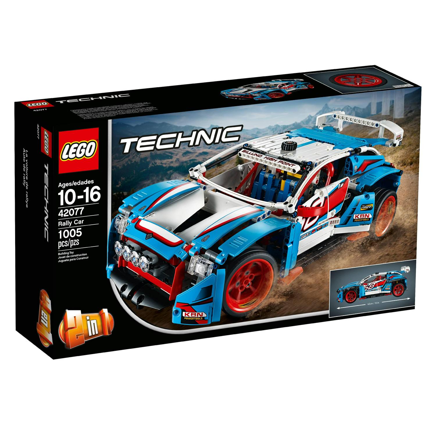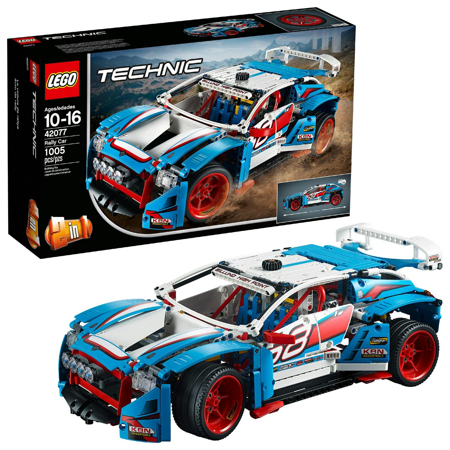 Discover awesome detail and design with this amazing 2-in-1 LEGO Technic 42077 Rally Car model, featuring sporty blue, white, red and black bodywork with racing stickers, large rear spoiler, 4 spot lamps and 6-spoke red rims with low-profile tires. This advanced builder set also features a detailed cockpit with racing seats and roll cage, 2-fan engine cooling system, opening hood and rear hatch, and a V6 engine with moving pistons. Rebuild the Rally Car to create a Buggy for a double build and play experience.