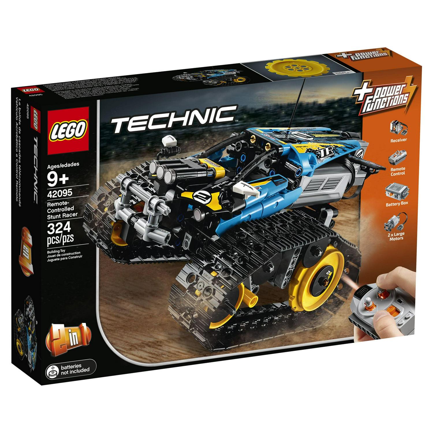 Pull high-speed wheelies, spins and turns, and traverse rough terrain with the LEGO Technic 42095 Remote-Controlled Stunt Racer. The ultimate motorized vehicle for kids. This tough 2-in-1 model features 2 large ground-gripping tracks with large rear sprockets for optimal acceleration, and a modern design with a fresh yellow and blue color scheme and decorative stickers. Drive forward, backward, left or right and make 360° turns. Rebuild this remote-controlled tracked vehicle to create a Remote-Controlled Racer for a double build-and-play experience.
