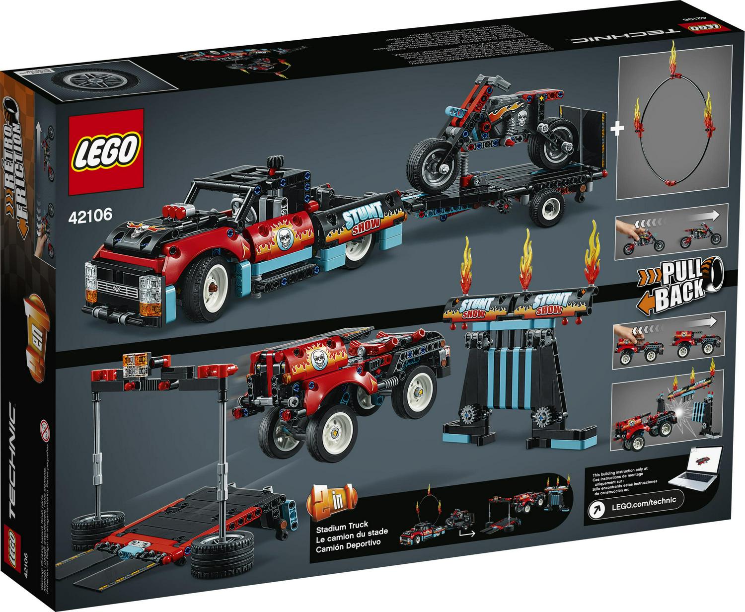An action-packed building challenge, with motorbike, toy pick-up truck and trailer. And for extra-daring adventures a flaming ring of fire! With easy-to-use pull-back control, motorbike fans can create heroic stunts as they send their stunt motorcycle soaring towards the flames. The truck features top steering, opening doors and cool stickers to fire kids’ imaginations. Meanwhile, the motorbike has chunky tires and even more sticker details. This building kit is packed with exciting features to keep builders and motorbike fans busy. The detachable trailer transforms into a toy ramp to power the bike into the air. Then after performing cool stunts, transport the motorcycle in the trailer, ready for the next hair-raising event. Or for a new challenge, rebuild the model into a Stadium Truck set. LEGO builders can discover the basics of force and movement with this LEGO Technic Stunt Show Truck & Bike set.