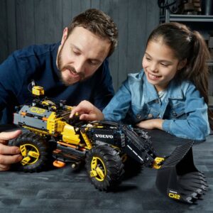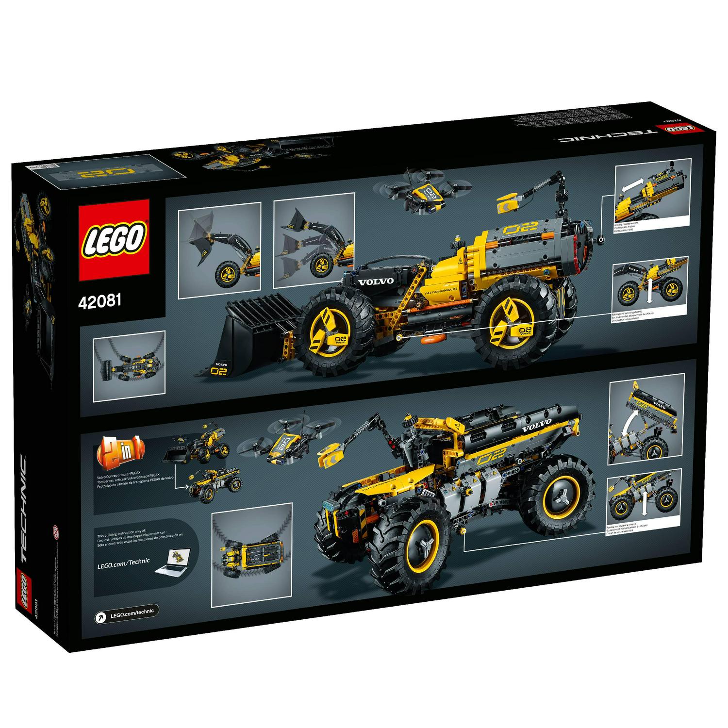Explore the future of construction machines with the LEGO Technic 42081 Volvo Concept Wheel Loader ZEUX. Developed in collaboration with Volvo, this futuristic construction toy comes with an array of realistic details, including a buildable mapping drone. The Volvo CE loader s design is high tech, right down to the futuristic rims wrapped with large heavy duty tires. Manual functions include 4-wheel steering, simultaneous or independent boom and bucket operation, and an adjustable counterbalance. This 2-in-1 technical toy comes with a classic Volvo color scheme and a set of stickers for additional detailing, and rebuilds into a futuristic Volvo Concept Hauler PEGAX.