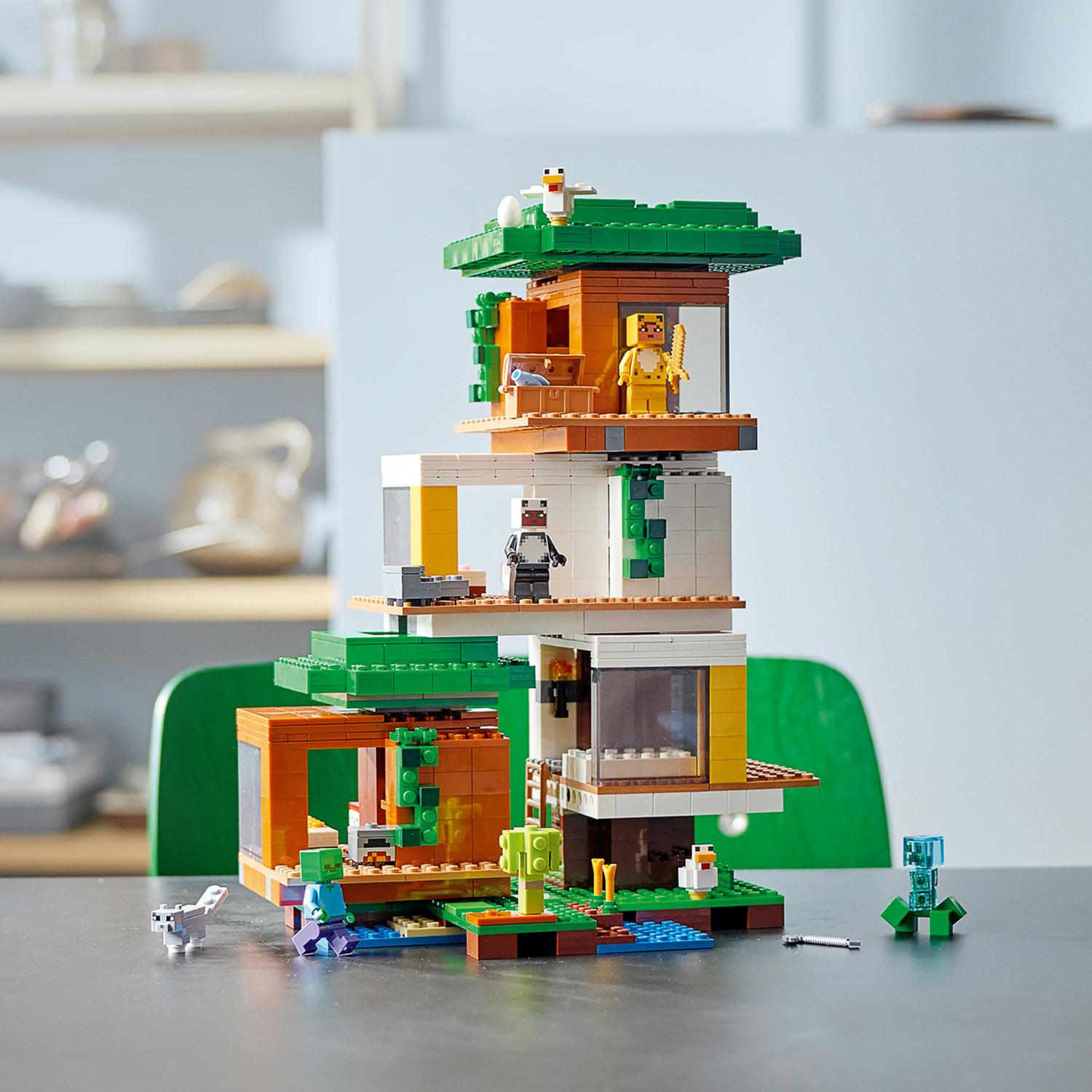 LEGO Minecraft the modern treehouse (21174) is a large, detailed, and extremely versatile playset that will give enduring pleasure to Minecraft players and any child who enjoys creative construction. Kids build 4 very different rooms kitchen, library, study, and bedroom then add a variety of authentic Minecraft accessories from furniture and bedding to tools and TNT. Rooms don t even have to be attached to the tree. The set is ideal for children whose imaginations stretch beyond the walls of traditional dollhouses.