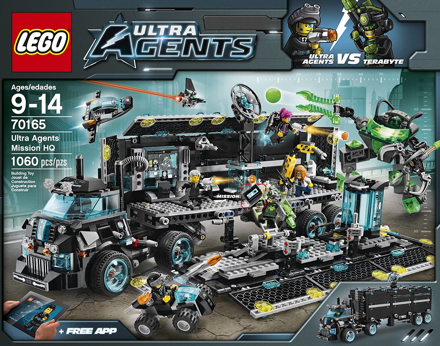Emergency! Evil cybernetic hacker Terabyte is attacking the Ultra Agents’ mobile Mission HQ on a mission to disable Astor City’s entire communication network. Drive the high-tech truck in undercover mode and fire the automatic missile shooters to fend him off. Launch the hidden flyer to spy for enemies from above. Push the lever to detach the driver’s cabin and open up the rear of the truck to reveal the inside of the awesome HQ. Plug in the laptop containing the top-secret mission plans in the briefing room and view them on the big screen. Analyze clues and carry out tests in the lab with Professor Christina Hydro. Strap on a jetpack and attach the extendable robot arm to prepare Agent Phoenix for lift-off. Stop Terabyte escaping with the laptop containing all the Ultra Agents’ secret files while his hi-tech much tries to destroy the communications system by firing hacking bombs at the satellite dish. Launch the buggy down the ramp and fire the stud shooters to defend the Ultra Agents HQ. You must capture this criminal nerd in the high-tech prison cell before he can cause any more damage! Includes 5 mini figures with accessories: Terabyte, Agent Solomon Blaze, Agent Caila Phoenix, Agent Curtis Bolt and Professor Christina Hydro. Ultra Agents Mission HQ in undercover mode features a lever-operated detachable driver’s cabin, opening cockpit, blue energy wheels, dual automatic spring-loaded shooters and a detachable hidden flyer. Ultra Agents Mission HQ in open HQ mode features a fold-out side for easy play and a briefing room with two slide-out seats, screen, laptop and plug-in slot for laptop, computer area with satellite dish, laboratory area with extendable robot arm, jetpack, computer and microscope, ladder, 2 stud shooters, buggy with 2 flick missiles and a prison cell. Terabyte’s much features a cockpit with mind-control plug-in tubes, a huge spinning grabbing claw, hacking bomb ball shooter, sensors and a detachable surveillance drone with dual cannons. Package Quantity : 1