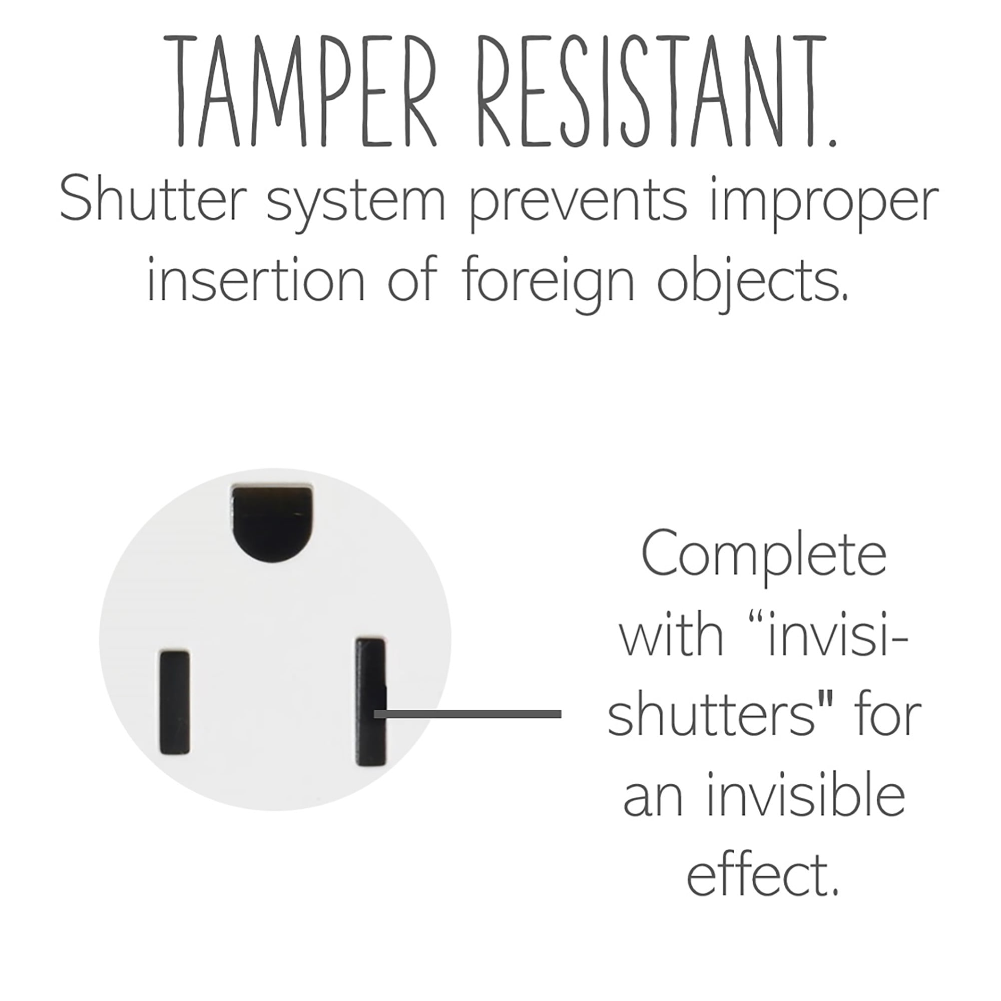 Features Tamper resistant to protect children: the patented shutter system helps prevent improper insertion of foreign objects When you’re ready to plug something in, just push on the box and he outlets will “pop out,” enabling easy access to power Easy “1-for-1″ installation lets you simply replace your existing outlet with adorne in just minutes Requires a minimum box size of 22.5 cubic inches Does not require new wires for typical installation Innovative assembly and snap-in system make it fast and simple to install Constructed from thermoplastic Tamper resistant mechanism with shutters capable of resisting insertion of foreign elements into the device UL and CUL rated for dry locations Covered under a limited lifetime manufacturer warranty Dimensions Height: 5″ Width: 3-3/4″ Depth: 2” Product Weight: 0.8 lbs Electrical Specifications Amperage: 15 Voltage: 120 volts Grounded: Yes